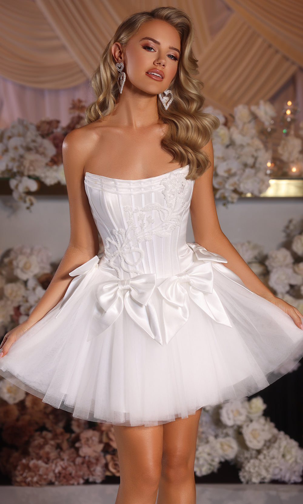 | Details: | Corset Boning Bodice, Beaded Appliques, Bow Accent, Layered Skirt, Strapless |