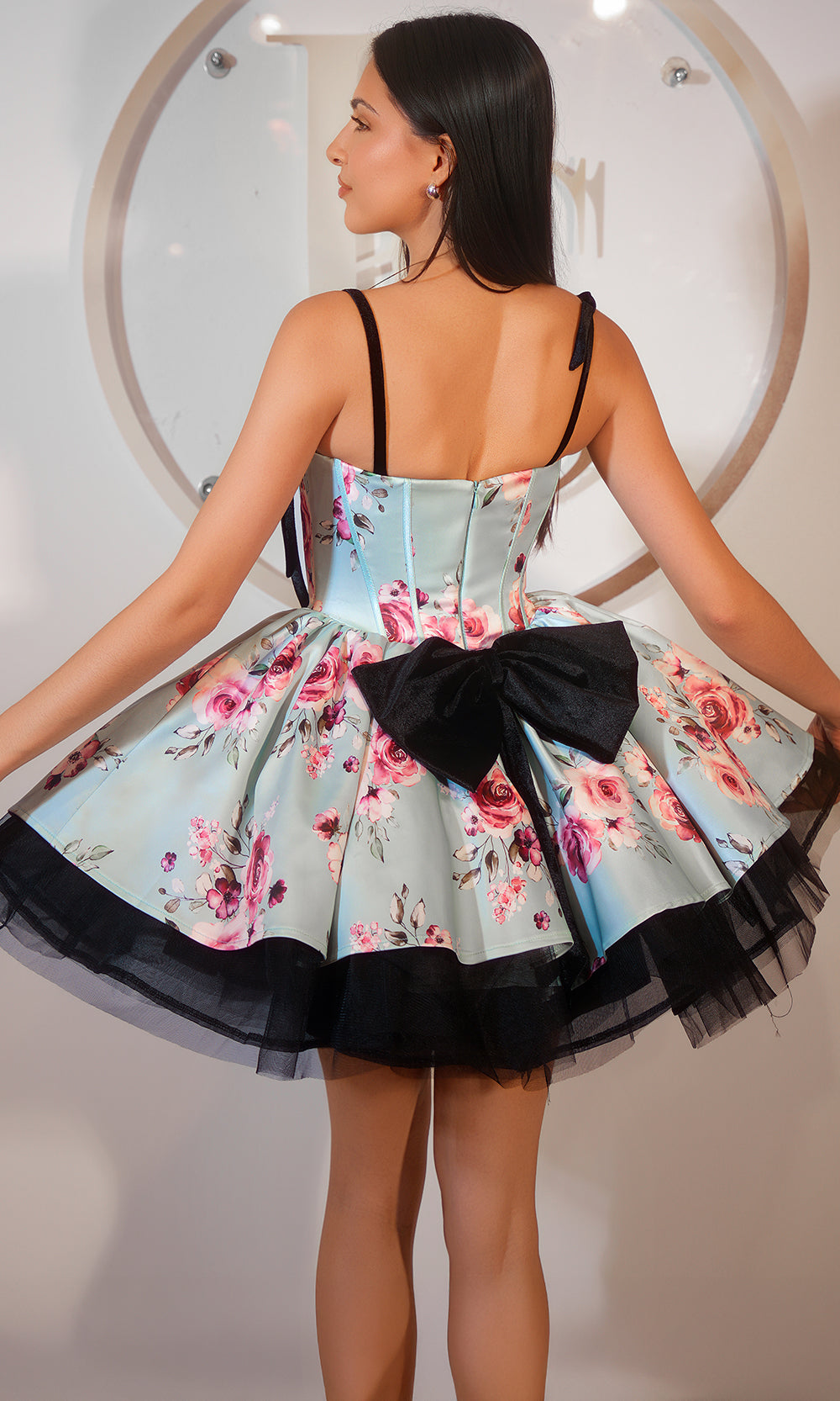 Delight in vintage-inspired charm with this Portia and Scarlett PS25765 short dress that blends playful elegance with modern flair. This sleeveless style features a structured floral print and corset boning bodice with delicate black ribbon straps that tie into the sweetheart neckline. The voluminous A-line skirt is underlined with layers of sheer, adding a bold contrast to its romantic floral print. Choose Portia and Scarlett PS25765 mini dress to make your next event unforgettable with soft drama and feminine grace. Models are wearing Black, Blue White, Lilac, Mint, Pink, and Ice Blue colors.