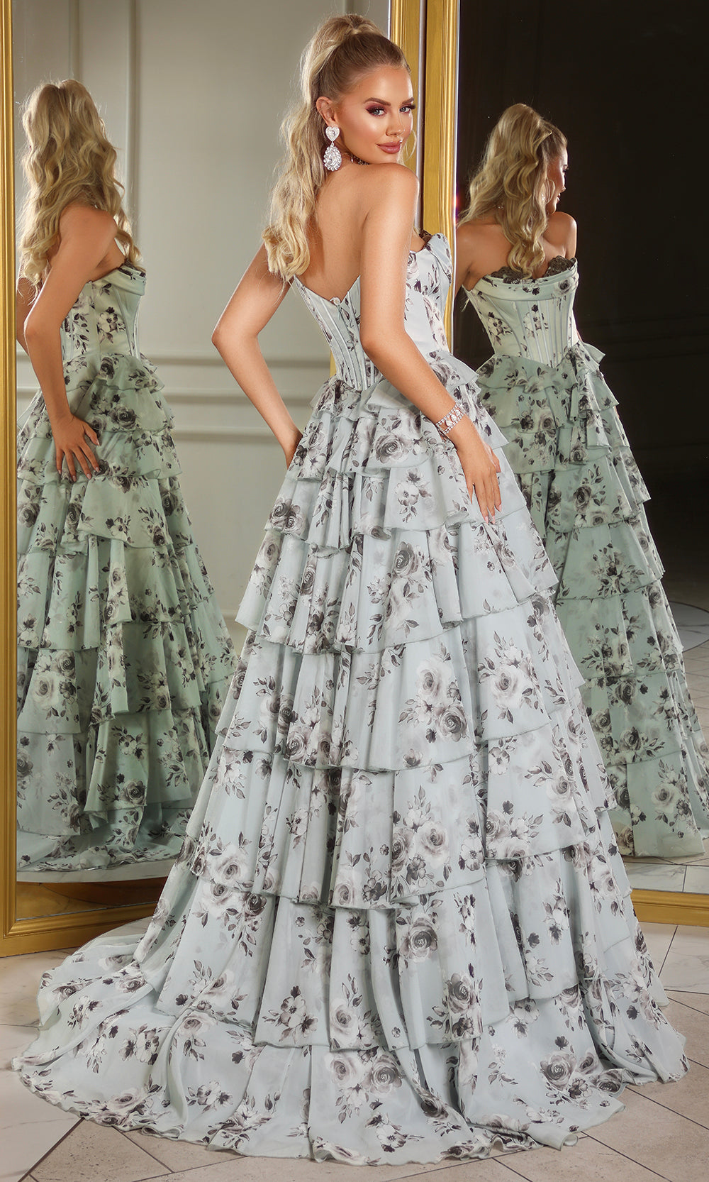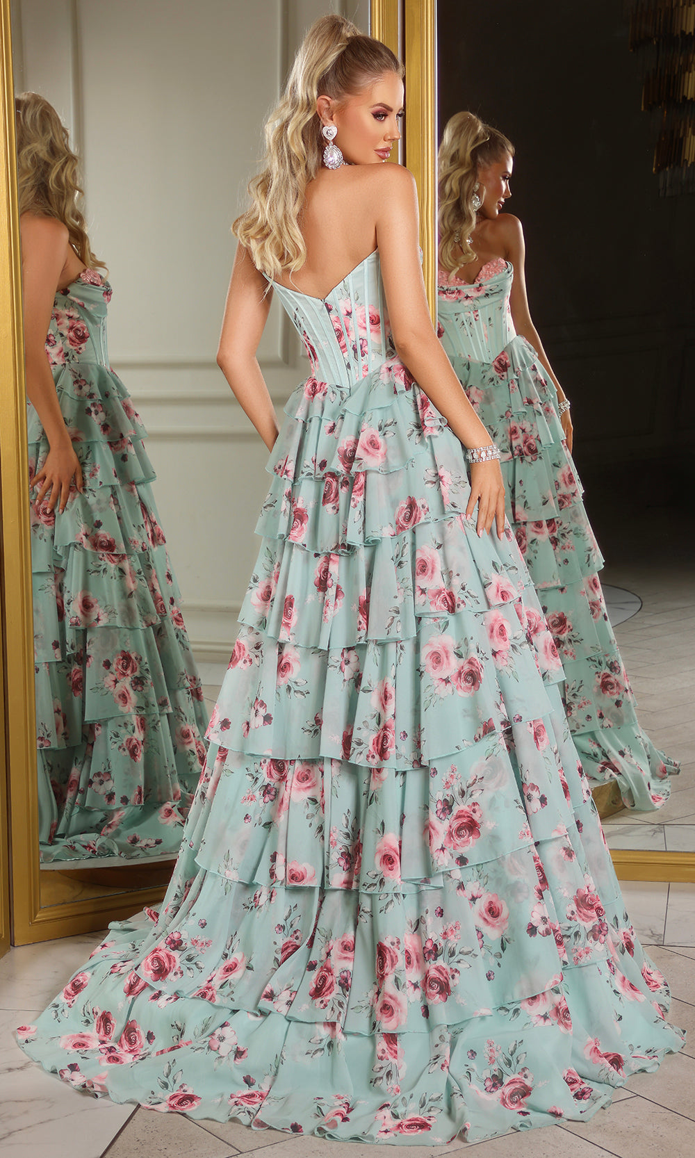 Portia and Scarlett PS25960 reinvents floral glamour through architectural layers and captivating contrast. A sweetheart corset bodice gives structure to the upper silhouette, drawing in the waist and enhancing posture. The ruffled tiered skirt flows with dramatic softness, sweeping outward in waves of floral print. A leg-baring slit offers a contemporary balance, ensuring the look feels fresh and striking. The Portia and Scarlett PS25960 masterpiece harmonizes fairytale beauty with bold modernity, crafted for timeless appeal. Models are wearing Black, Blue, Mint, and Pink colors.