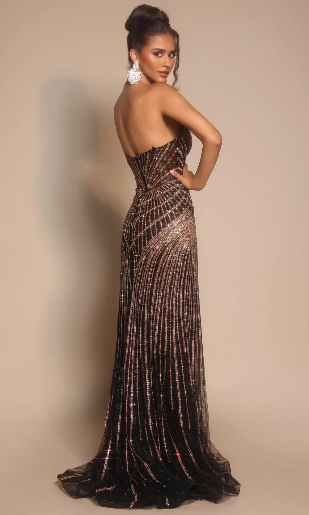 | Details: | Strapless, Geometric Bead Embellishment, Fitted Silhouette, Sweeping Train, Low Open Back |