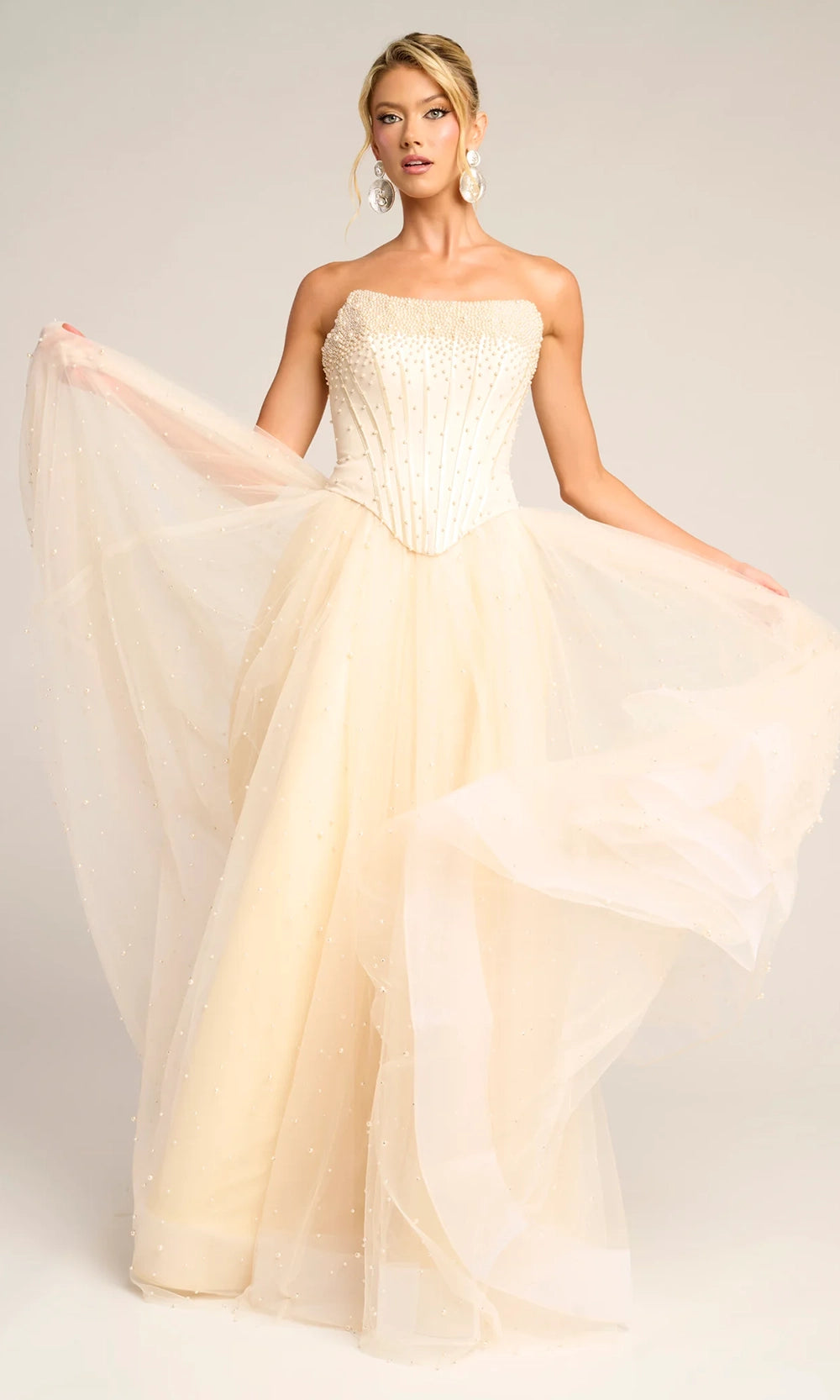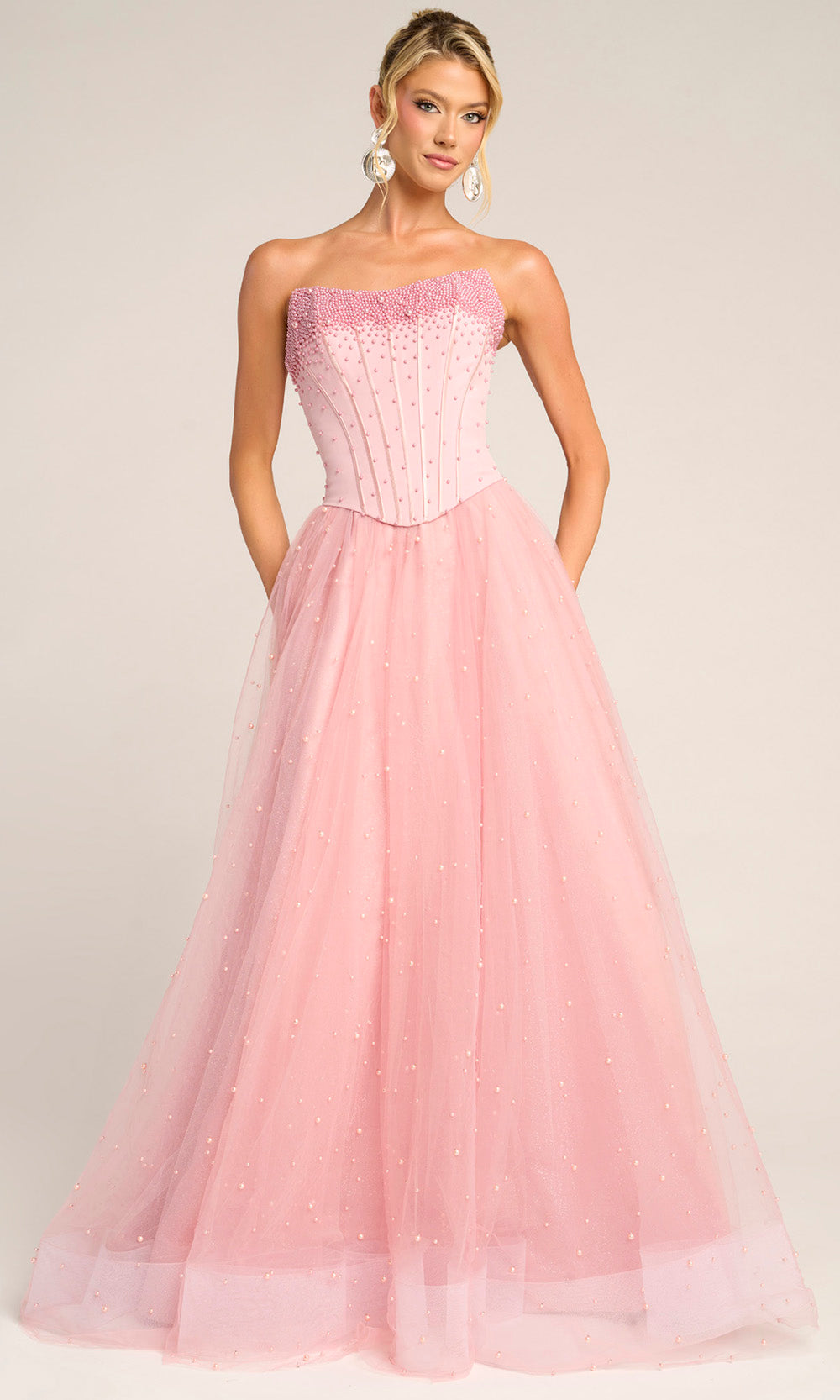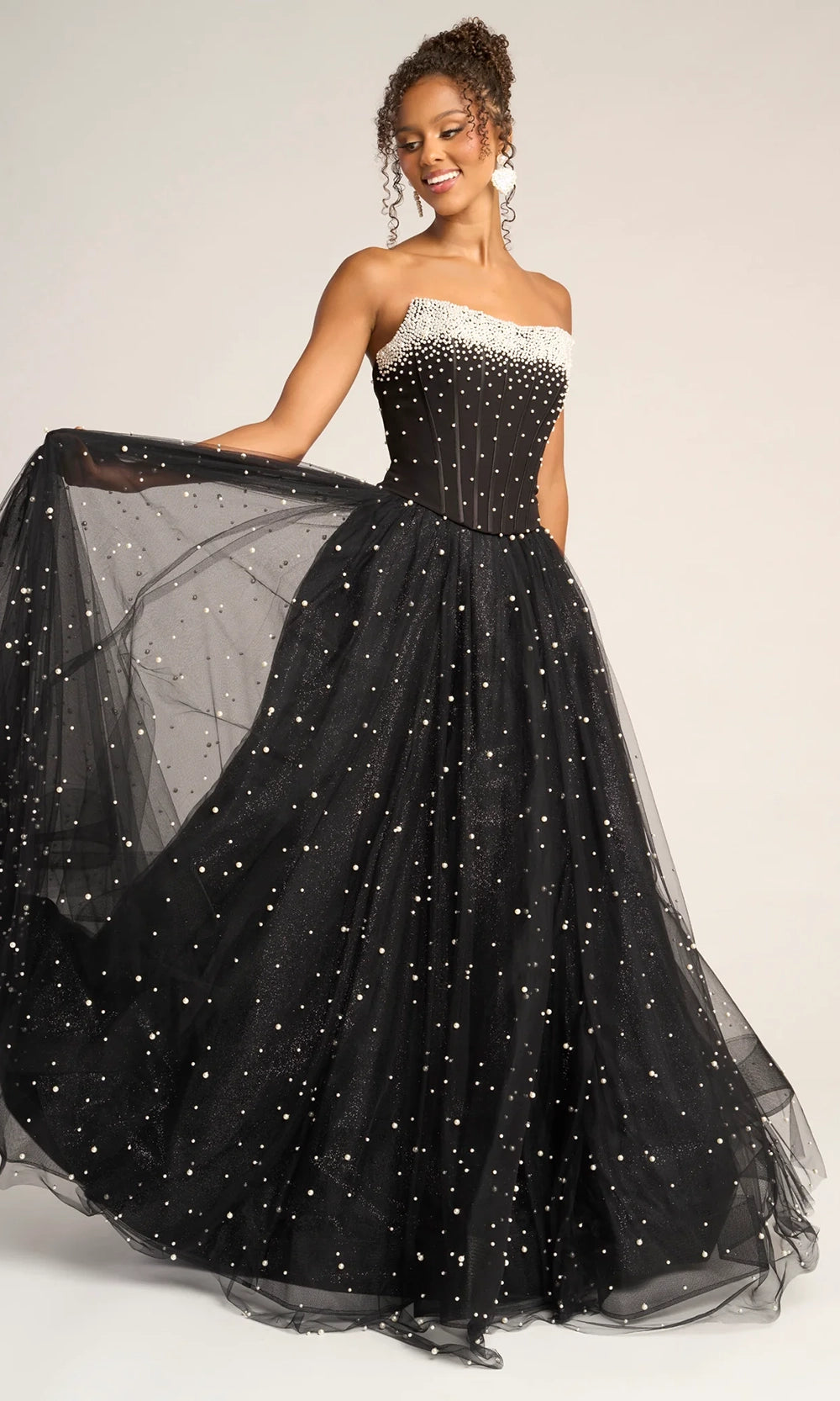 A vision of storybook romance comes to life in this enchanting prom gown from Portia and Scarlett PS26034. With its corset-style bodice adorned in delicate pearl beading, the strapless gown glows with ethereal charm. The A-line skirt made of layered tulle flows from a Basque waistline, offering volume without weight. Let the Portia and Scarlett PS26034 be your choice for an evening filled with fairytale elegance and magical moments. Models are wearing Black, Cream, Pink, and White colors.