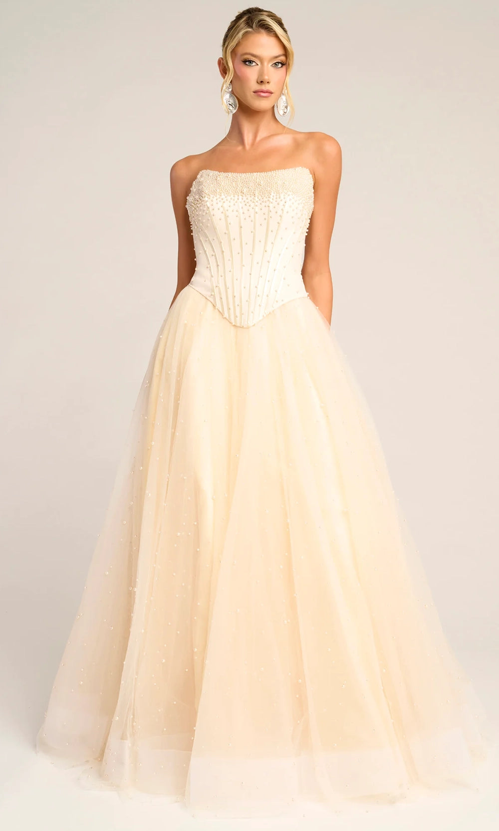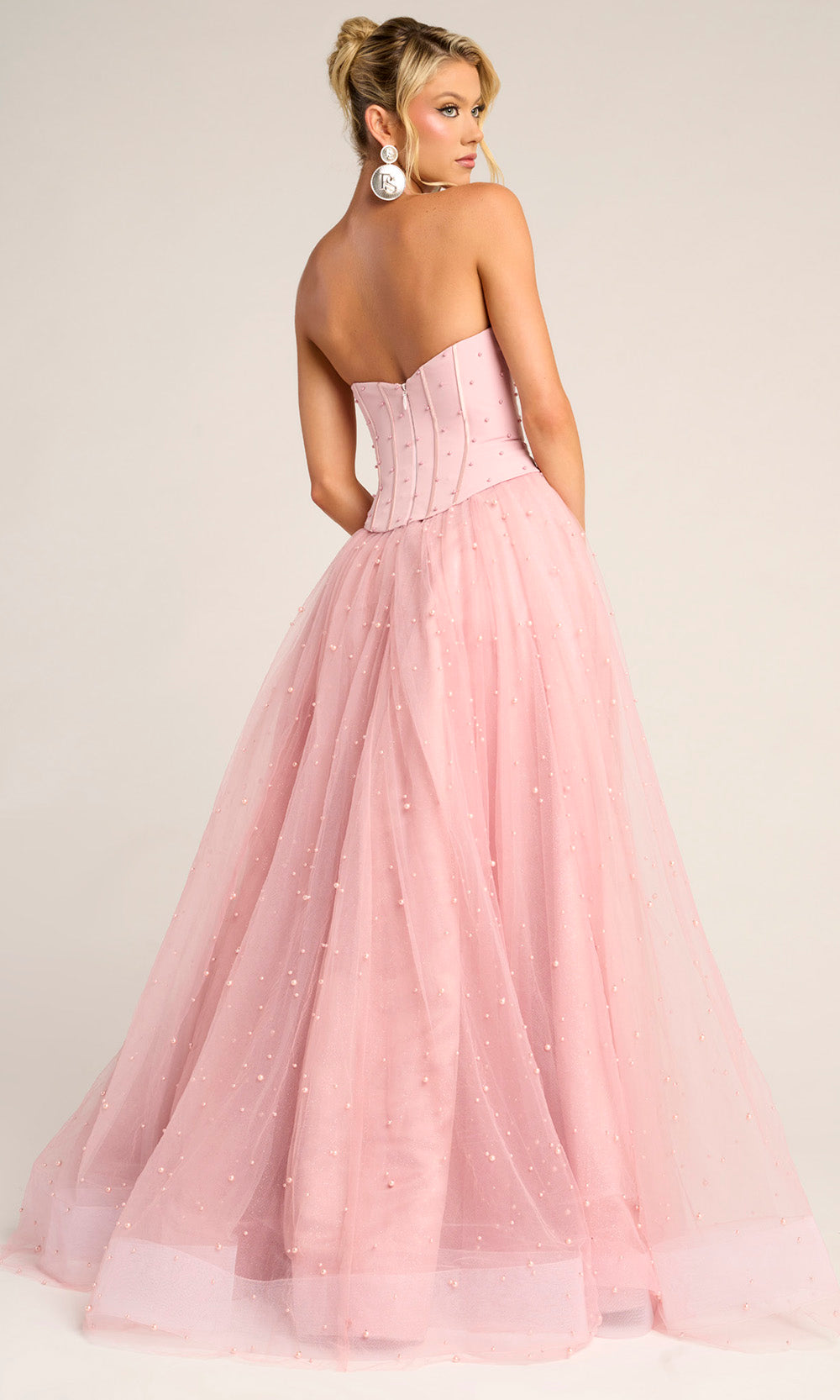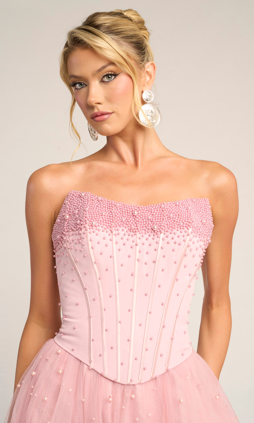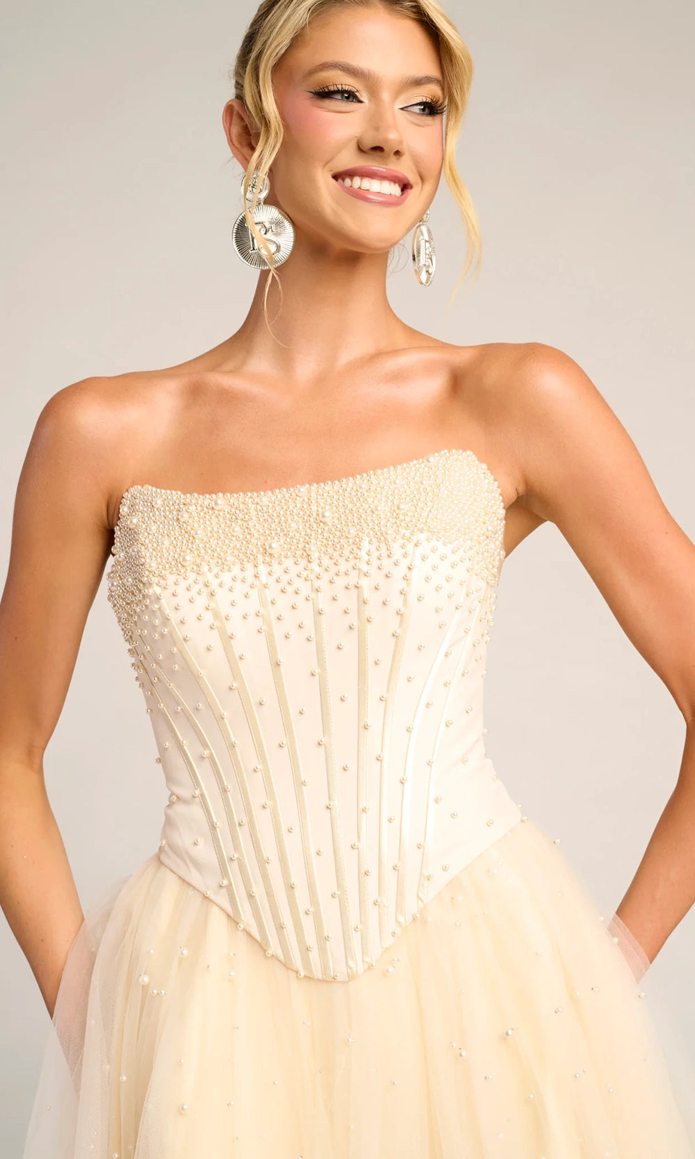 A vision of storybook romance comes to life in this enchanting prom gown from Portia and Scarlett PS26034. With its corset-style bodice adorned in delicate pearl beading, the strapless gown glows with ethereal charm. The A-line skirt made of layered tulle flows from a Basque waistline, offering volume without weight. Let the Portia and Scarlett PS26034 be your choice for an evening filled with fairytale elegance and magical moments. Models are wearing Black, Cream, Pink, and White colors.