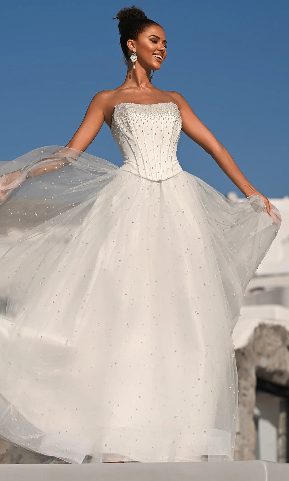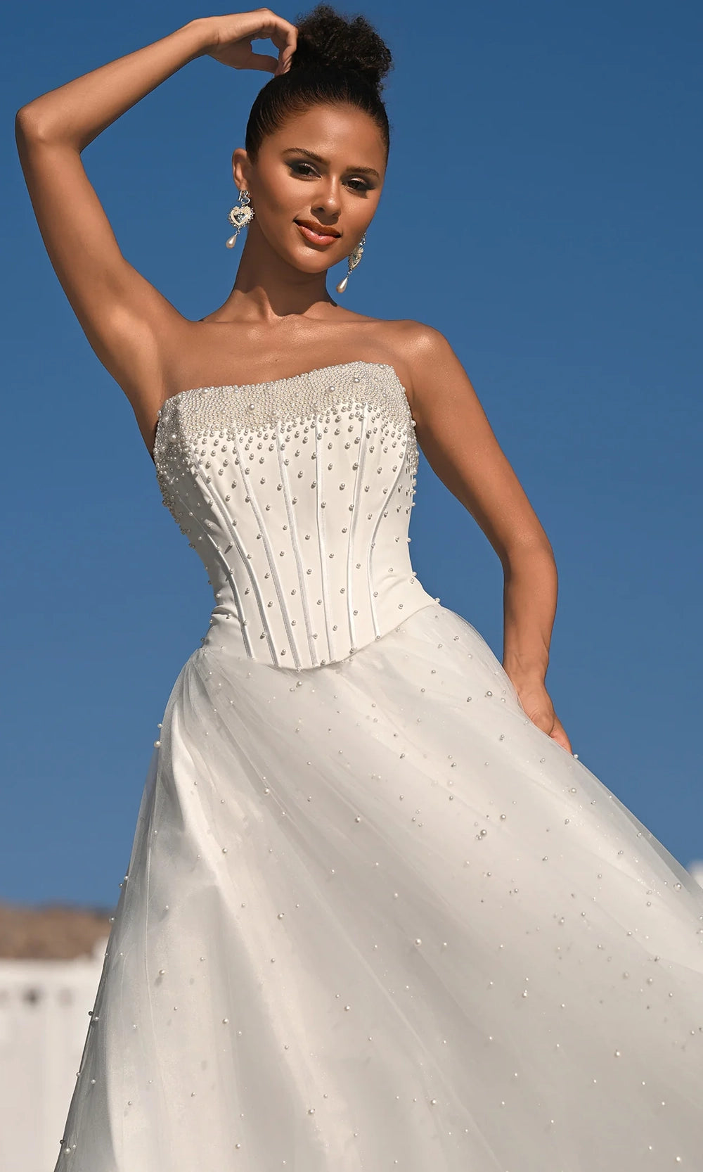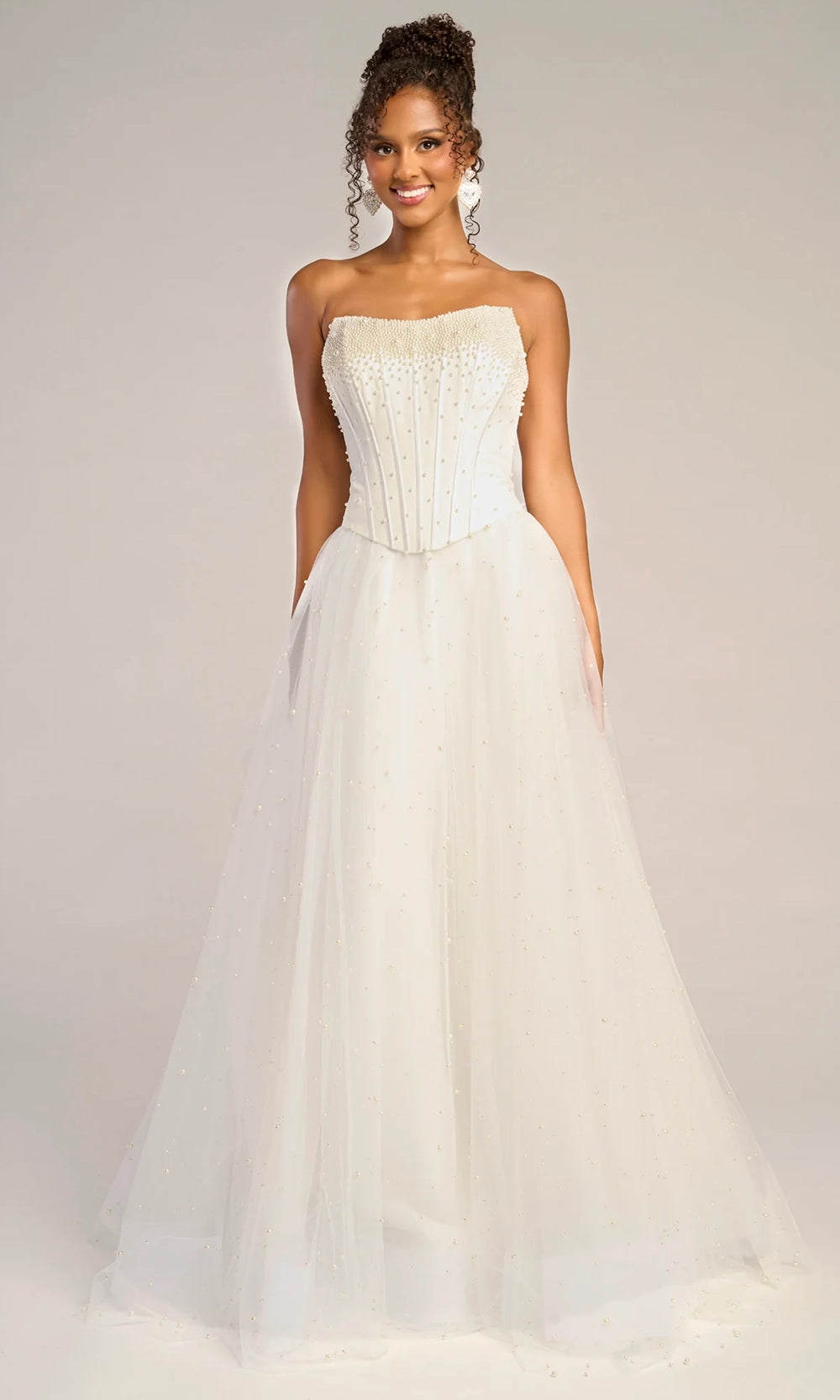 | Details: | Strapless Corset Bodice, Pearl and Beaded Accents, Layered Skirt, Horsehair Hem |