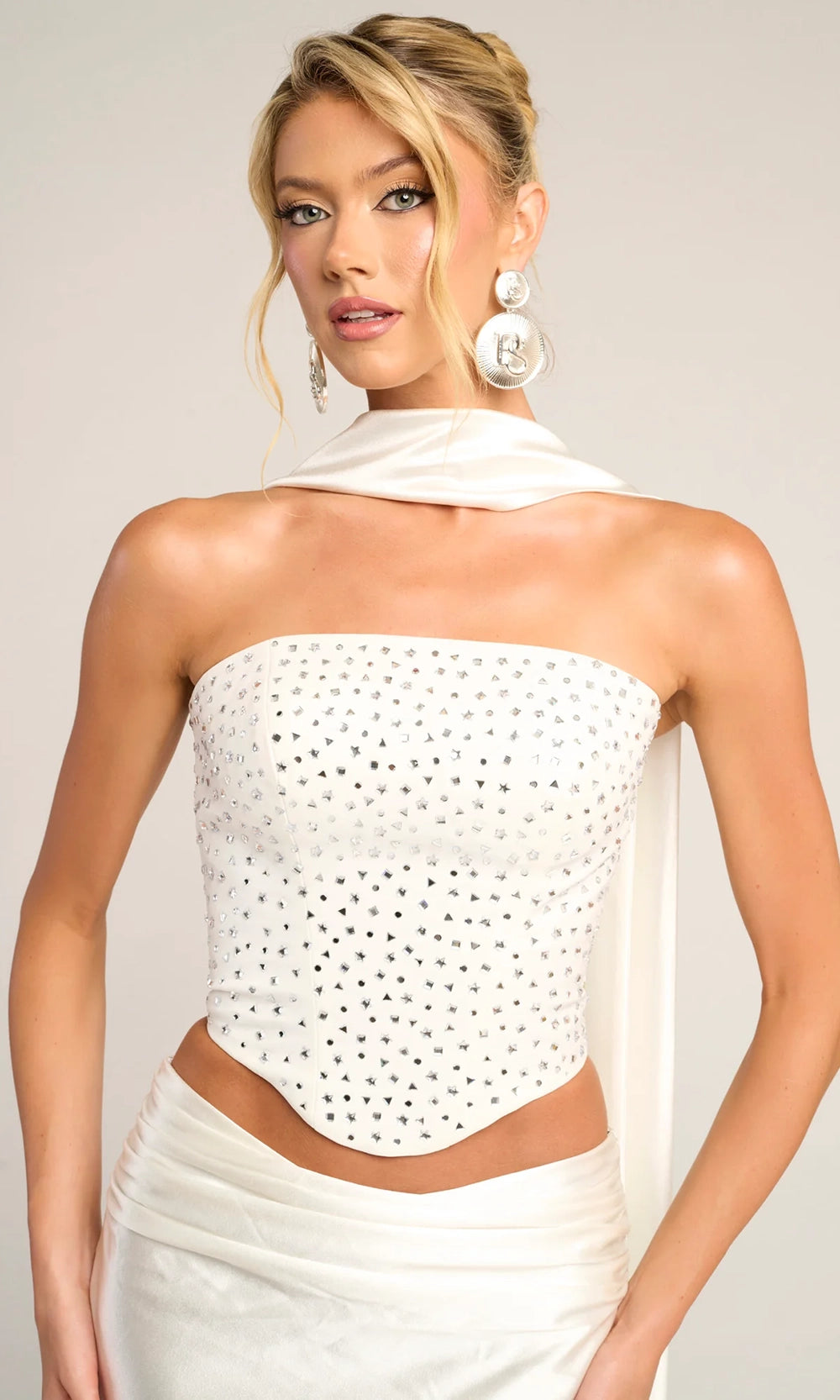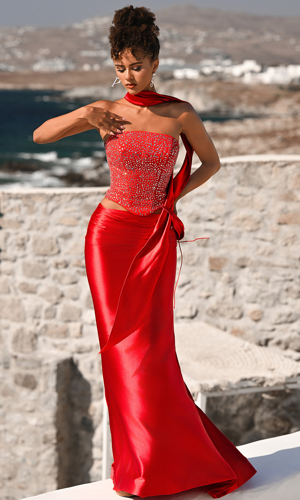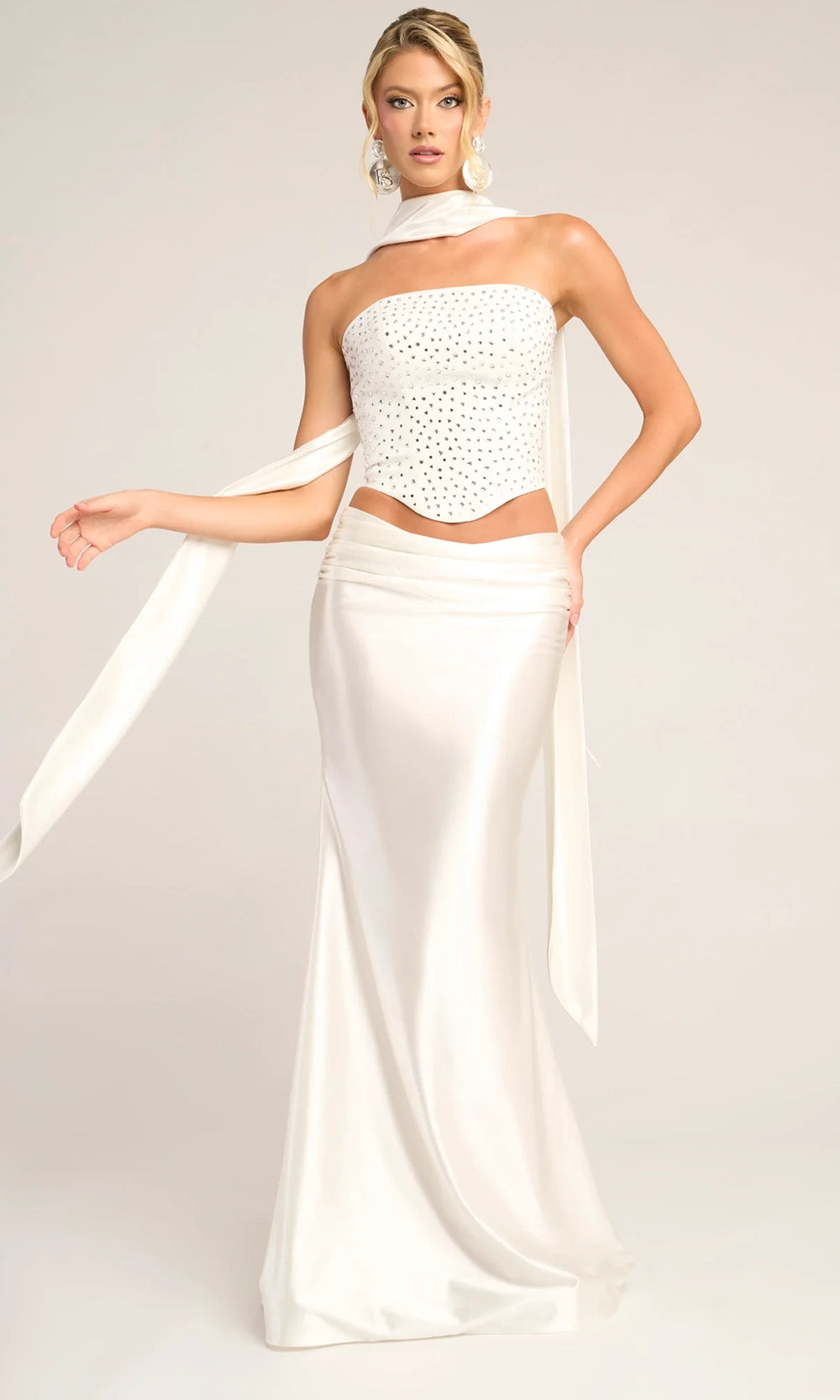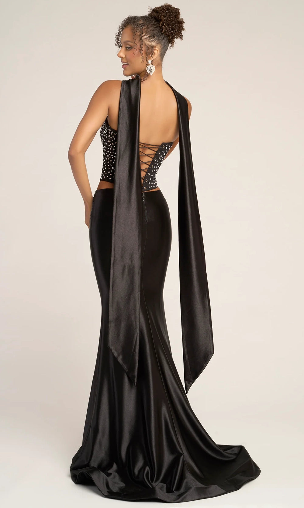 | Details: | Two-Piece Set, Strapless, Lace-Up Back, Scarf Detail, Sweep Train, Fitted Skirt |