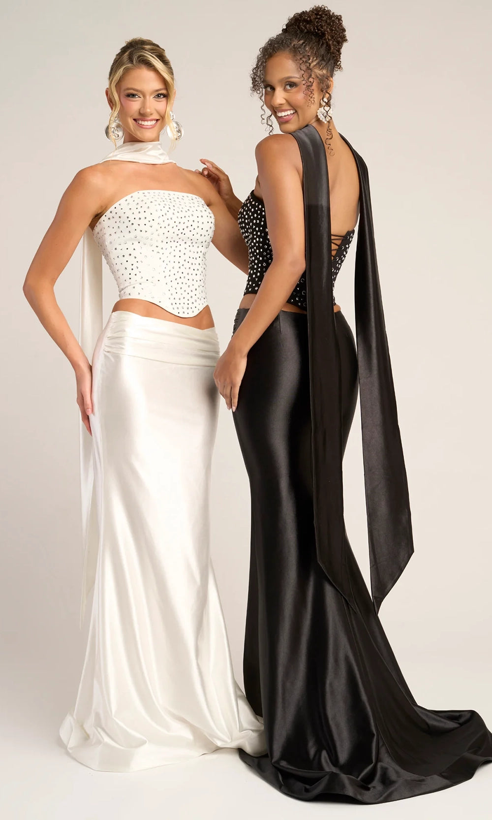 Minimalist styling meets high-fashion detailing in the Portia and Scarlett PS26042 two-piece dress. The strapless bodice features a sculpted shape covered in sparkling beaded embellishments, delivering dimension without overpowering the sleek silhouette. Paired with a softly draped sheath skirt, the dress creates a clean, statuesque outline that moves effortlessly. An included scarf accessory provides added versatility and drama, elevating the overall look. Perfect for those who appreciate sophisticated simplicity with a modern edge, the Portia and Scarlett PS26042 is a striking choice for any formal event. Models are wearing Black, Red, and White colors.