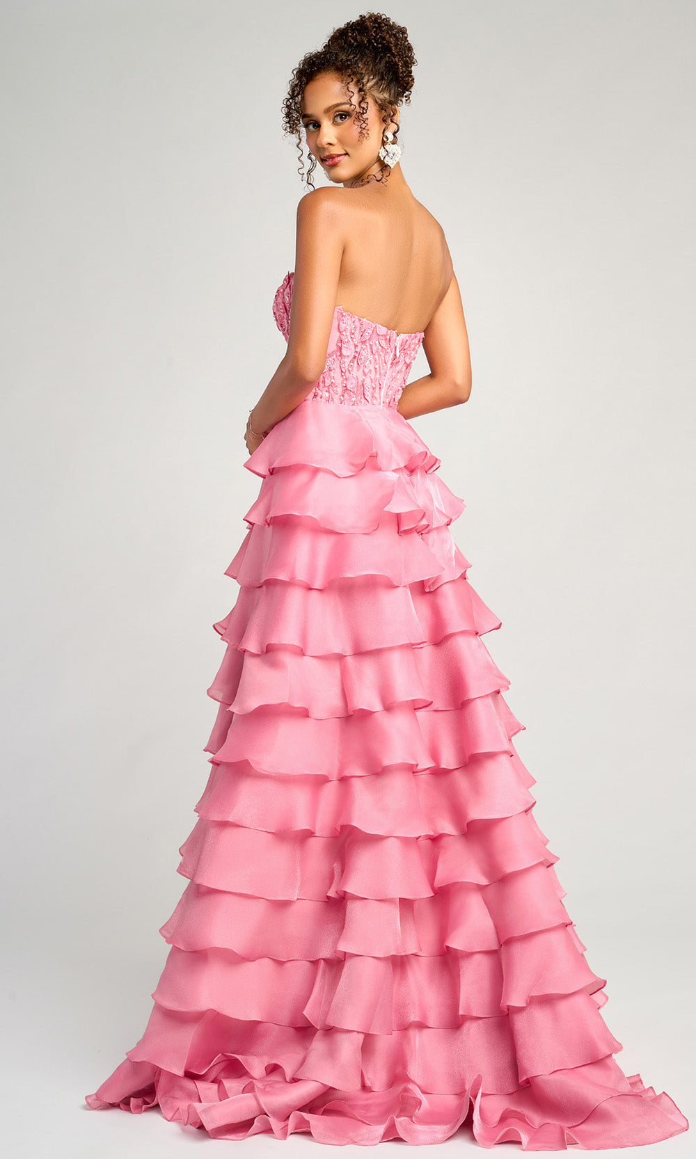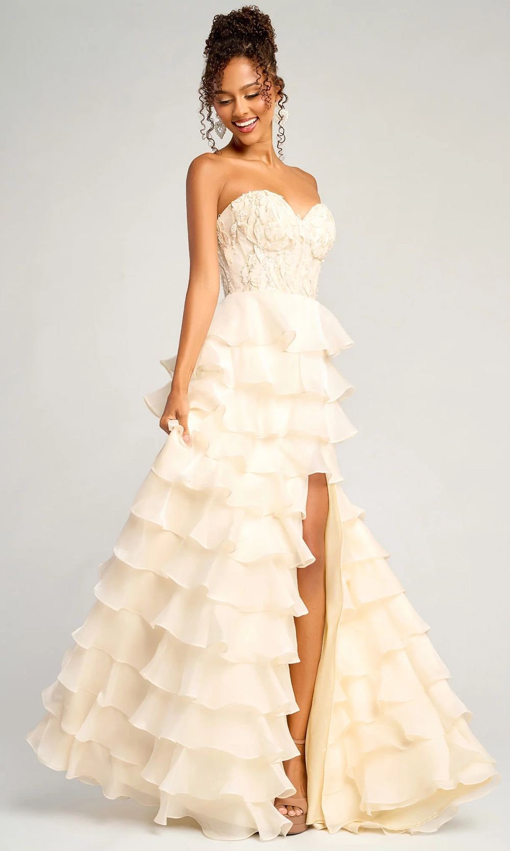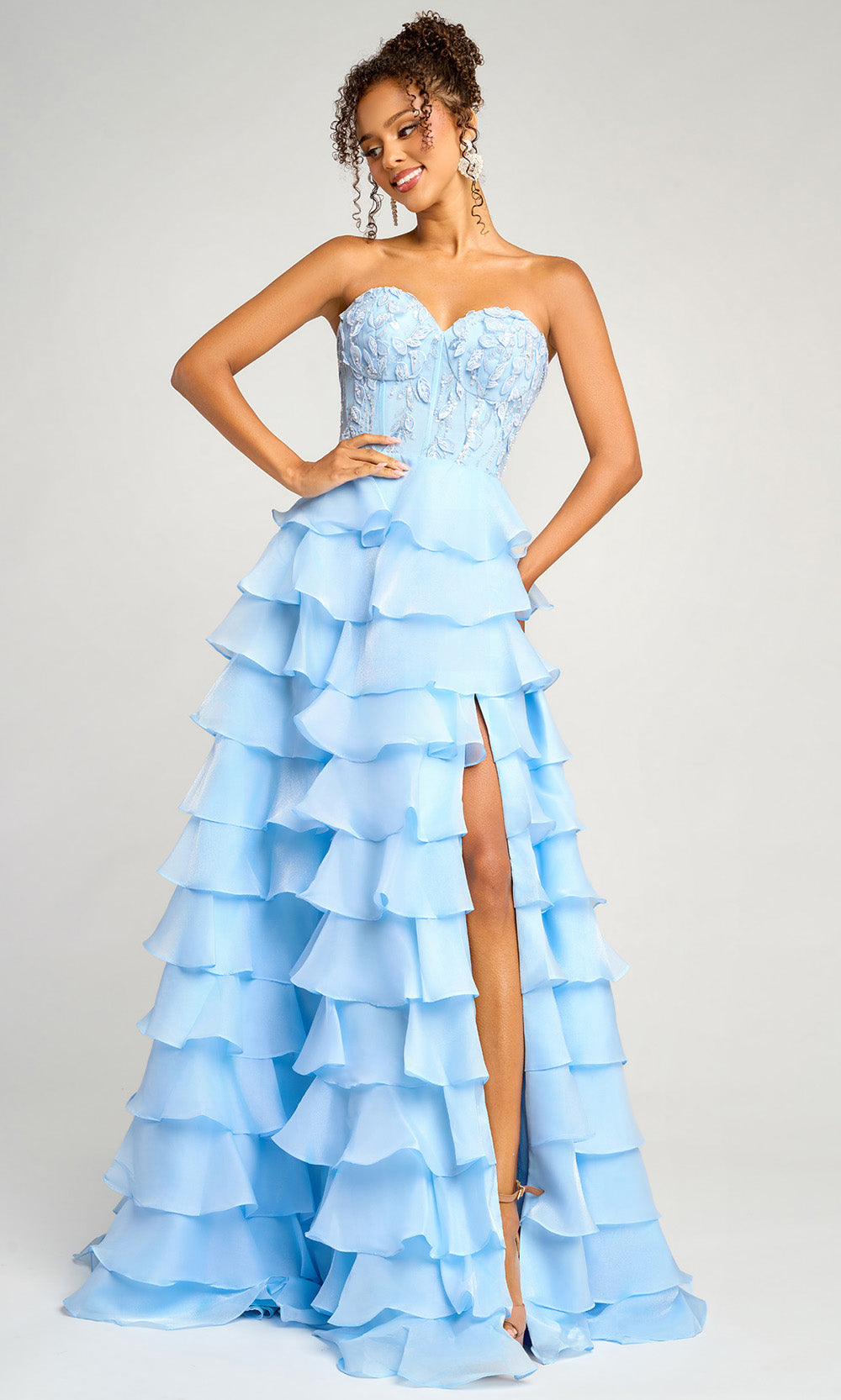 | Details: | Beaded Accents, Floral Embroidery, Strapless, Tiered Ruffle Skirt, High Slit |