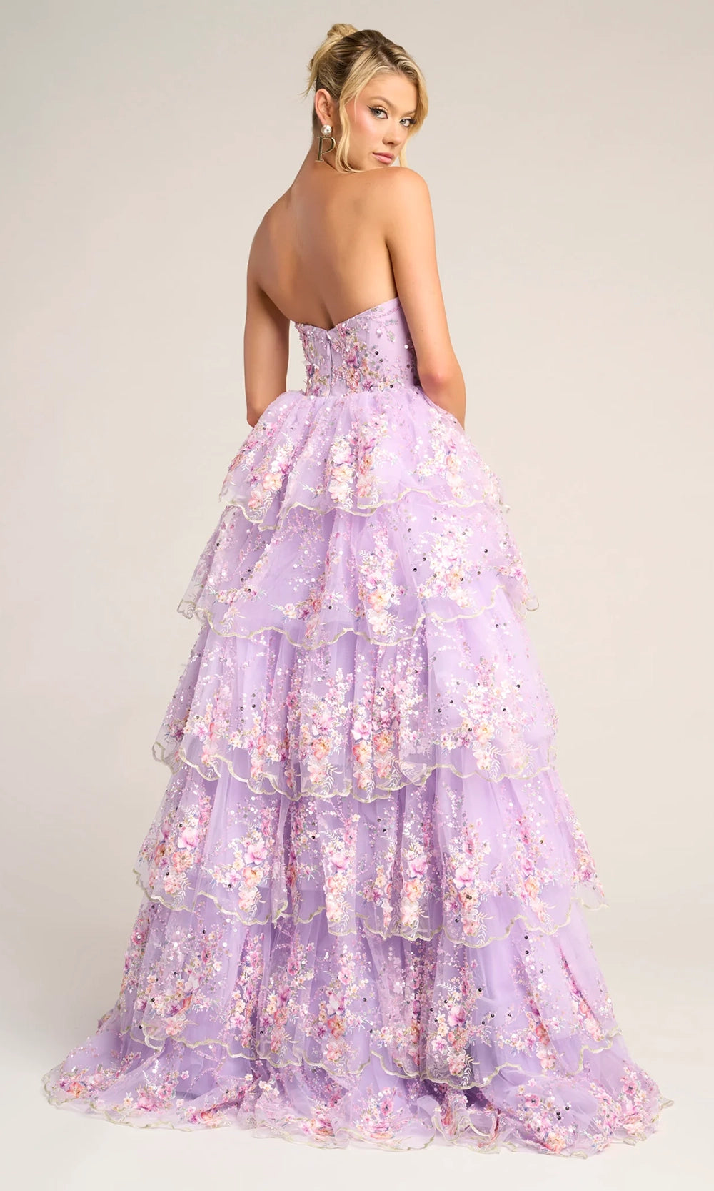 Romantic florals meet voluminous drama in this eye-catching Portia and Scarlett PS26051 ballgown. The strapless bodice is structured and fitted, leading into a dramatically layered ruffle skirt that moves beautifully with each step. Drenched in beads and floral embroidery, this look captures a delicate yet statement-making vibe. A front slit adds a contemporary twist to the otherwise classic silhouette, making it both fashion-forward and feminine. Portia and Scarlett PS26051 is an ideal choice for someone who values both charm and grandeur. Model is wearing Lilac color.