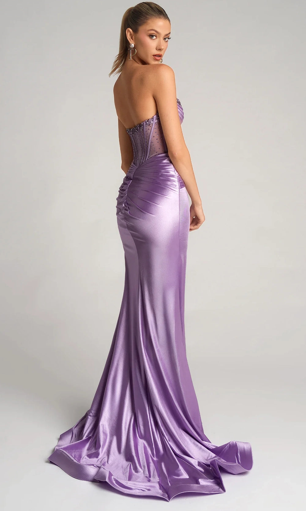 | Details: | Illusion Corset Bodice, Beaded, Strapless, Pleated Details, High Slit, Sweep Train |