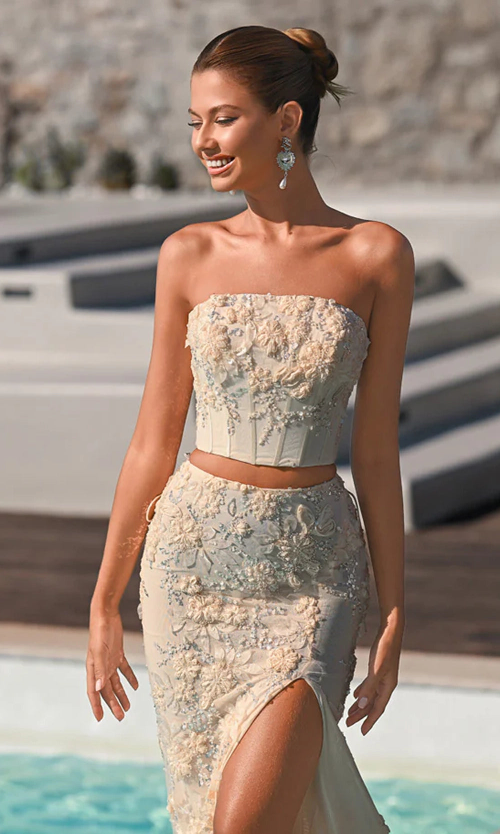 | Details: | Two-Piece Set, Strapless, 3D Floral Appliques, Beading, High Slit, Fitted |