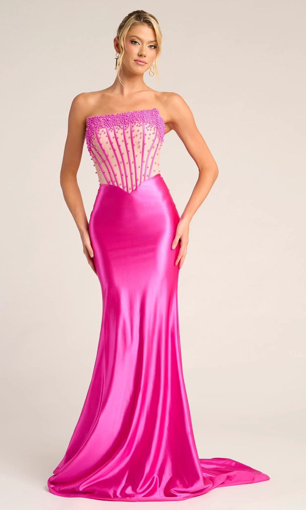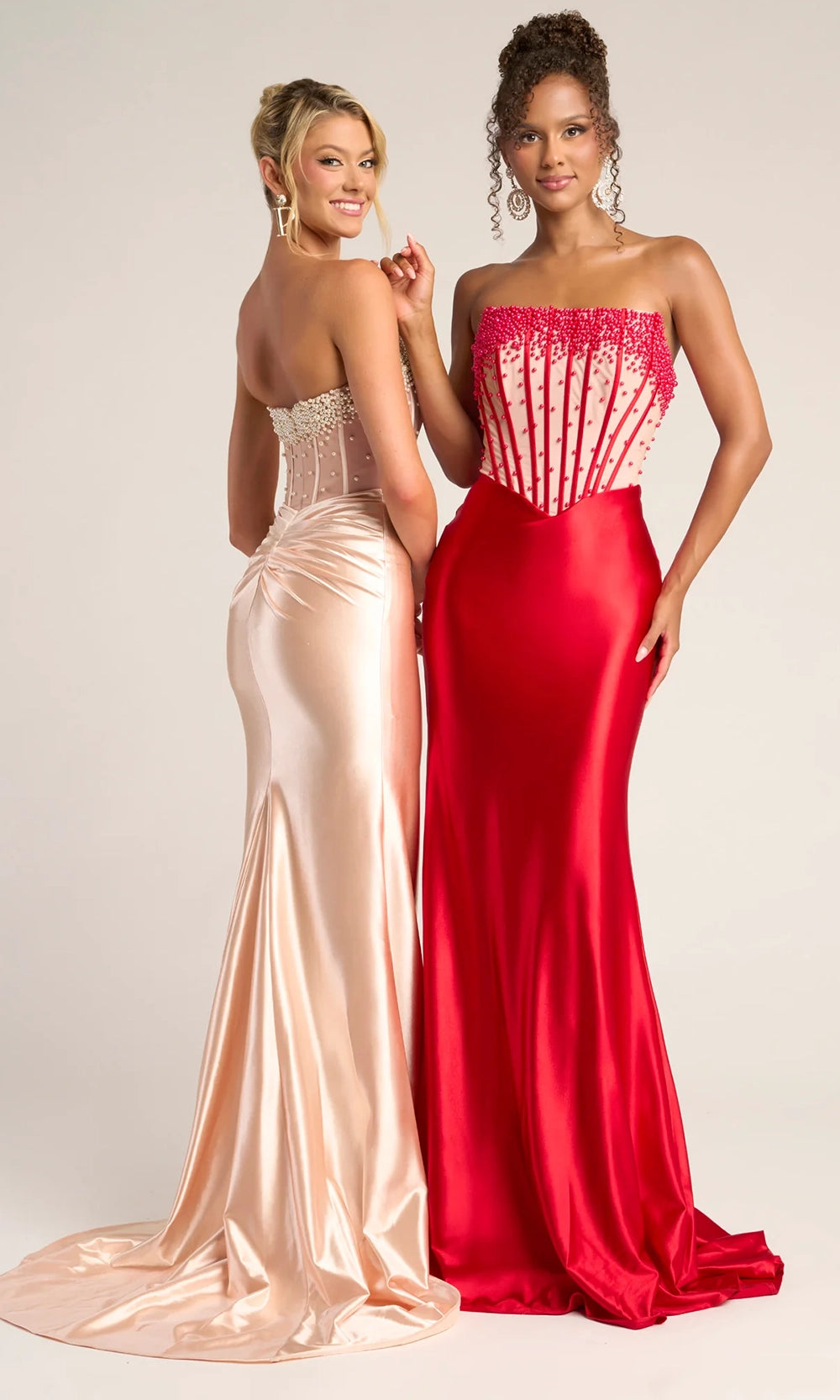 Unveil structured brilliance with the Portia and Scarlett PS26094, a dress defined by its illusion corset bodice and luxurious embellishment. The strapless straight neckline highlights the sheer boned structure, blending transparency with sculptural support. Beaded accents radiate across the surface, giving the look a rich visual rhythm. A form-fitting sheath skirt hugs the body and flows into a sweep train that trails behind with quiet drama. Portia and Scarlett PS26094 is designed for women who seek a blend of modern detailing and timeless elegance. Models are wearing Black, Champagne, Navy, Fuchsia, and Red colors.