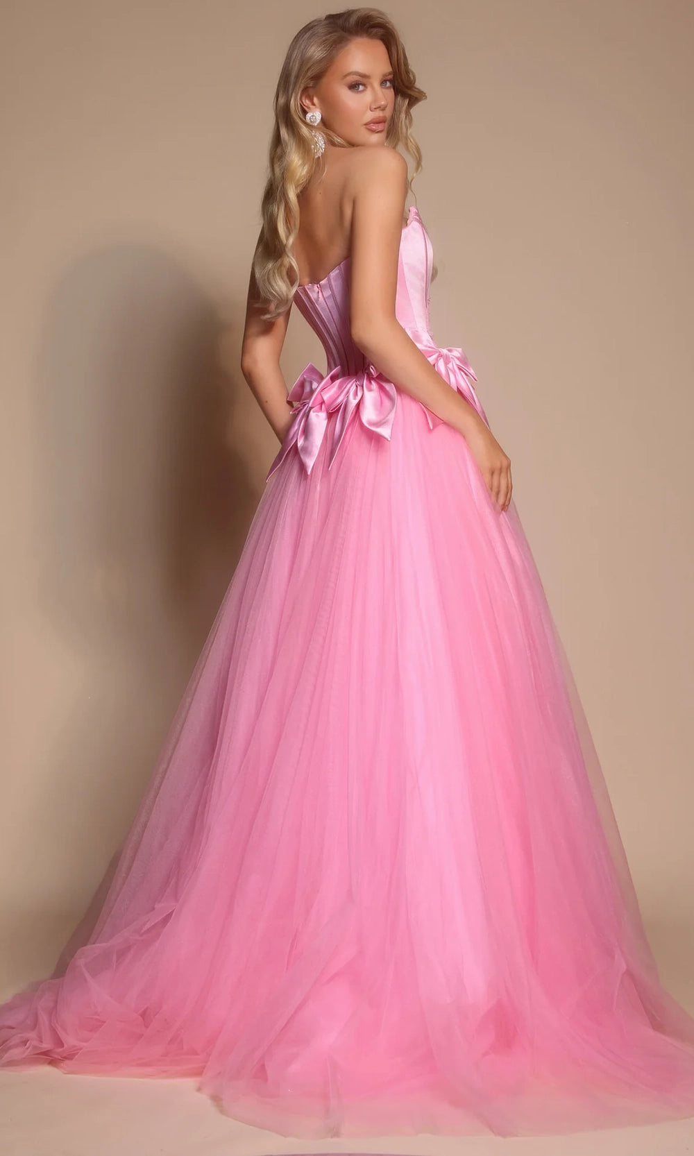 Whimsical meets regal in the Portia and Scarlett PS26102 creation. This gown captures the imagination with its full ballgown silhouette and a dramatic bows at the waist. The strapless scoop neckline leads into a structured corset-style bodice, enhanced by beaded embroidery for a touch of fantasy. The voluminous skirt sweeps gracefully, creating a floaty, ethereal effect. A gown meant for memorable entrances, the Portia and Scarlett PS26102 is a dreamy choice for those drawn to romantic silhouettes with standout details that command the spotlight. Models are wearing Black, Light Blue, Light Pink, and Red colors.