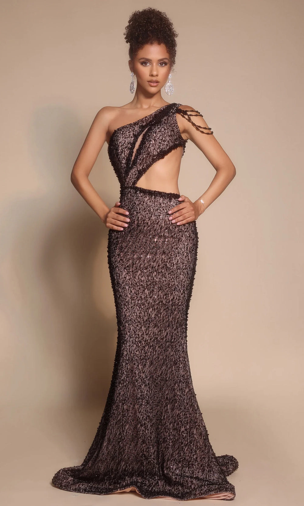 Striking from every angle, Portia and Scarlett PS26115 features daring design elements and intricate texture. The one shoulder neckline leads to a dramatic asymmetrical bodice with a side cutout that exposes the waist and torso with confidence. Beaded strands drape from the shoulder, adding movement and shimmer as you walk. The curve-hugging sheath silhouette enhances the form, while textured beading throughout creates depth and a tactile finish. A sweeping train elongates the look with red carpet flair. Portia and Scarlett PS26115 is your next show-stopping piece. Model is wearing Black/Nude color.