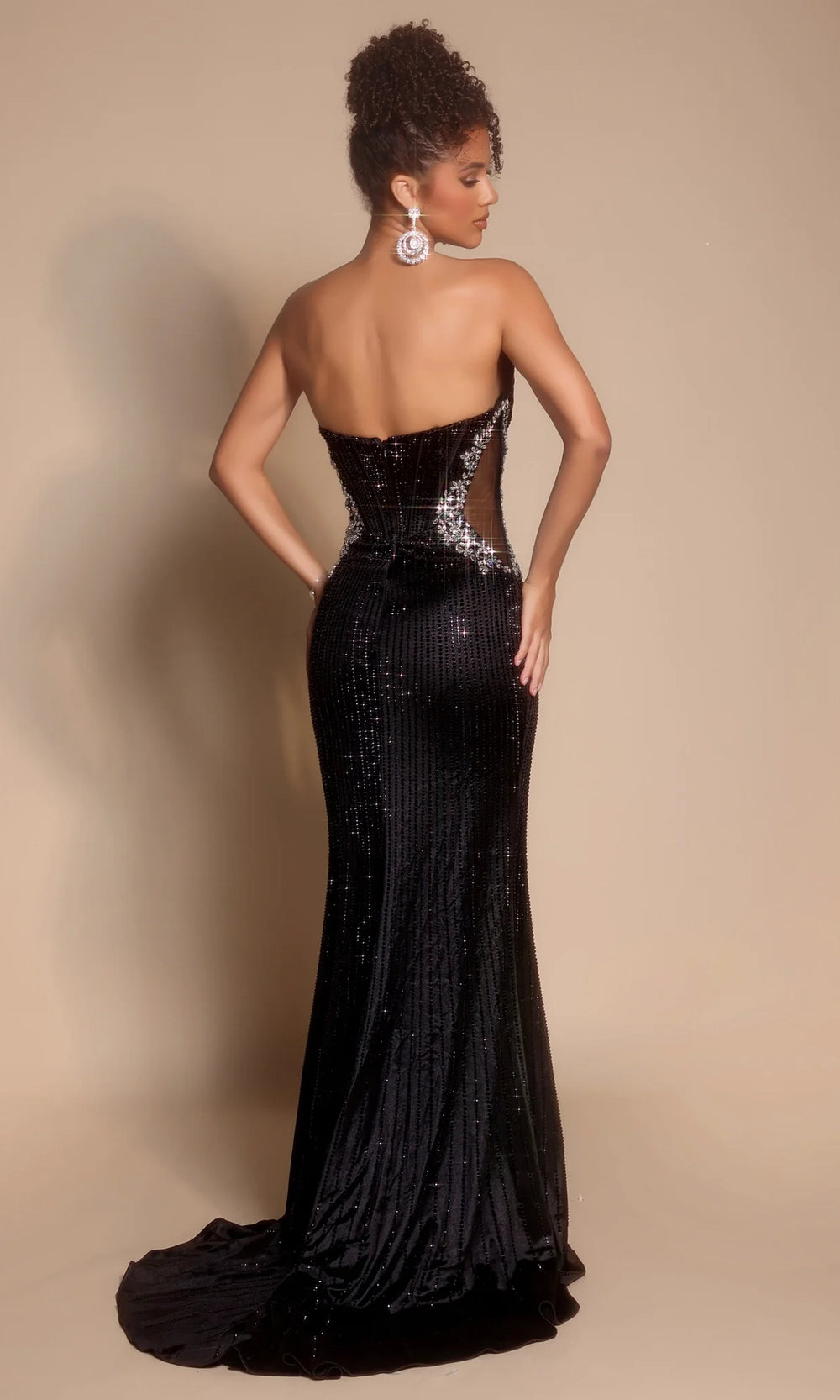 Unforgettable entrances begin with the radiant allure of Portia and Scarlett PS26147. This gown captivates with its strapless v-neckline and a plunging illusion inset that adds just the right amount of edge. The structured bodice molds beautifully into a sleek sheath silhouette, while beaded embellishments throughout the gown glimmer under the light. A daring side slit enhances the shape and adds an element of dramatic movement. Portia and Scarlett PS26147 is ideal for making a lasting impression at upscale evenings and special occasions where style matters most. Model is wearing Black color.