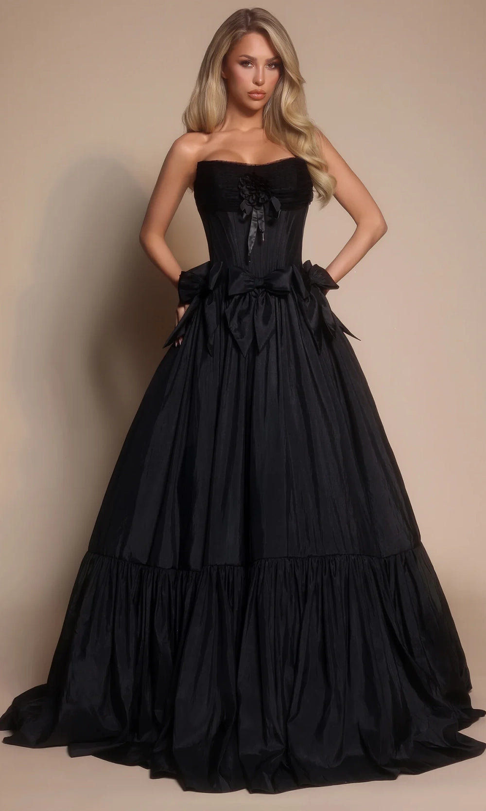 | Details: | Strapless, Gathered Bust, Rosette Accent, Full Skirt, Tiered Hem, Detachable Bow Details |