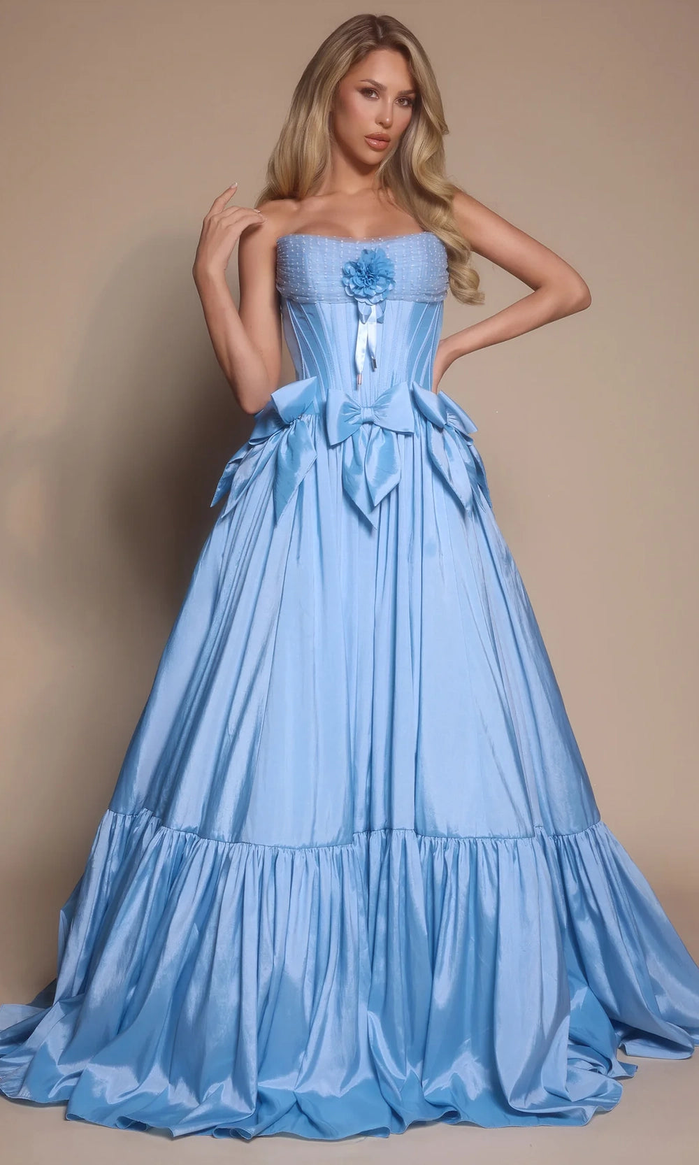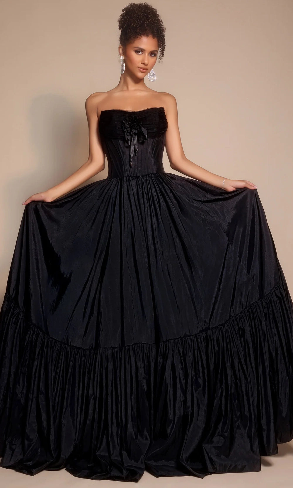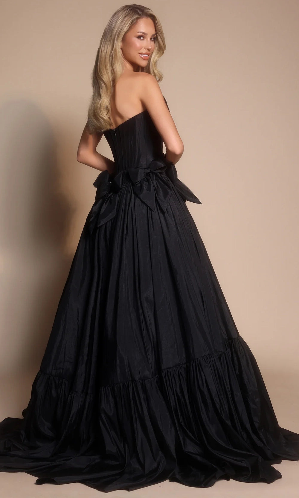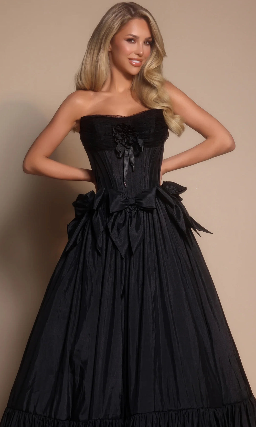 For those who adore a classic silhouette with a modern twist, Portia and Scarlett PS26148 is the perfect choice. This gown features a structured strapless bodice with delicate gathering across the bust and a soft rosette detail at the center. The voluminous ballgown skirt flows from the natural waist, finishes with a tiered hem and detachable bows for an extra flourish. With its romantic charm and timeless design, Portia and Scarlett PS26148 brings fairy-tale elegance to any grand occasion. Models are wearing Black, Light Blue, Blush, Red, and White colors.