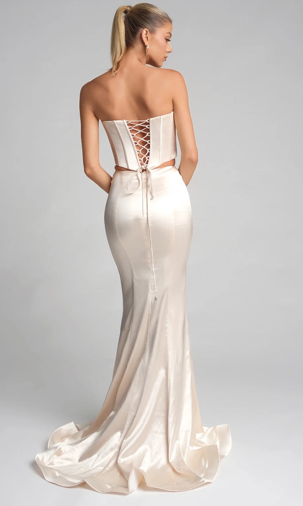 | Details: | Two-Piece Design, Strapless, Beaded Bust, Corset Lace-Up Back, Sweep Train |