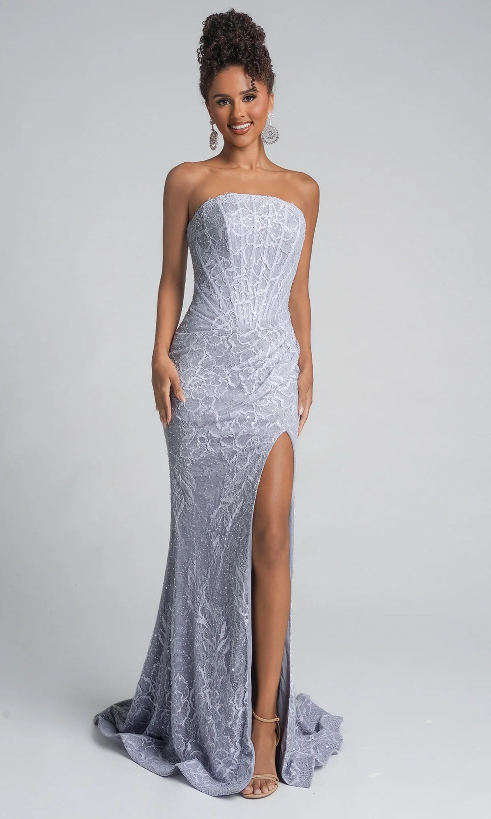 | Details: | Floral Lace, Shimmering Accent, Strapless, Corset Boning Bodice, High Slit, Fitted |