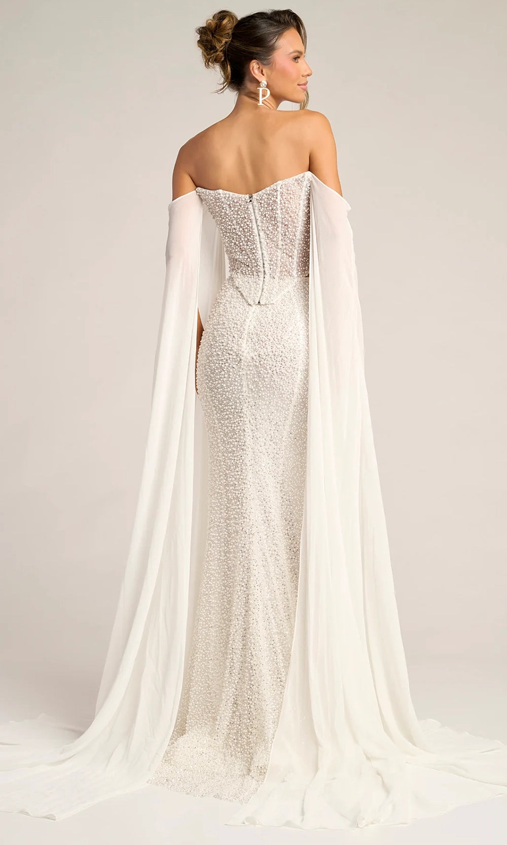 | Details: | Strapless, Illusion Corset Bodice, Detachable Off Shoulder Cape, Fitted Skirt, Two-Piece Set, Beaded |