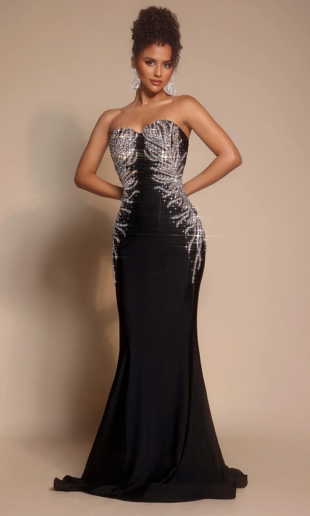 With its eye-catching beadwork and sculpted bodice, the Portia and Scarlett PS26331E delivers a glamorous edge suited for elevated occasions. The strapless sweetheart neckline enhances the fitted top, creating a flattering shape that naturally accentuates the waist. Rhinestone embellishments flow down the bodice and hips, creating visual interest and contour. With a subtle flare at the hem, the skirt forms a timeless sheath silhouette that moves with graceful allure. Ideal for any high-profile evening, the Portia and Scarlett PS26331E brings dramatic styling and a poised sense of polish to your eveningwear collection. Models are wearing Black, and Hot Pink colors.