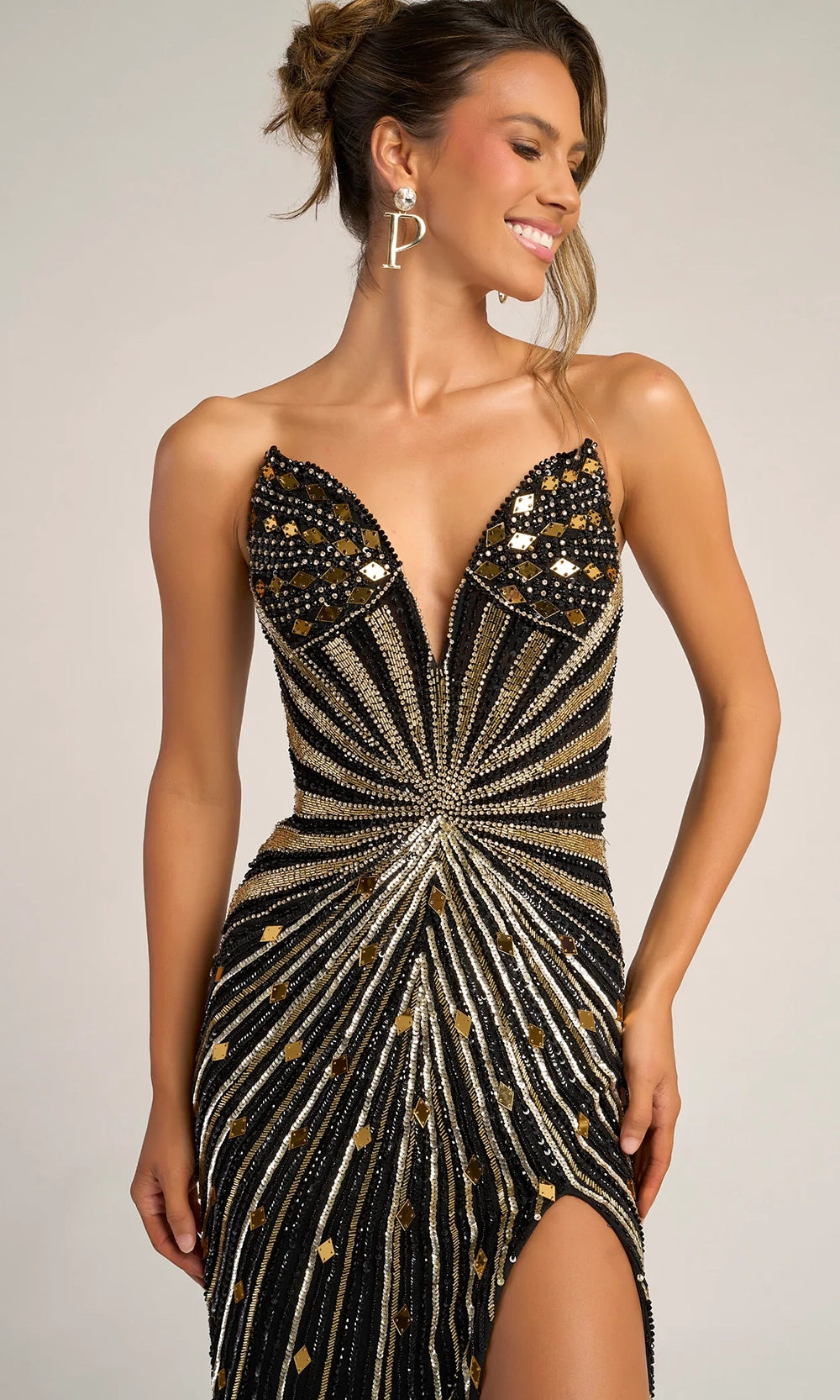 Portia and Scarlett PS26409C brings contemporary brilliance to life with glistening detail and confident shape. The plunging v-neckline frames the decolletage, while the mirrored embellishment and beadwork radiates outward like a starburst. A thigh-high slit adds sultry movement, perfect for an unforgettable walk into the room. Finished with a form-fitting sheath silhouette and smooth back closure, Portia and Scarlett PS26409C is ideal for the woman who wants a high-impact look with showstopping shimmer and sculptural flair. Models are wearing Black/Gold, Nude/Silver/Gold, Pink/Gold, and Blue/Silver colors.