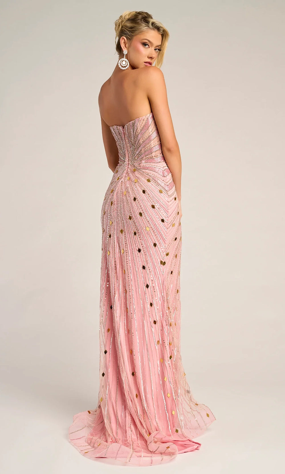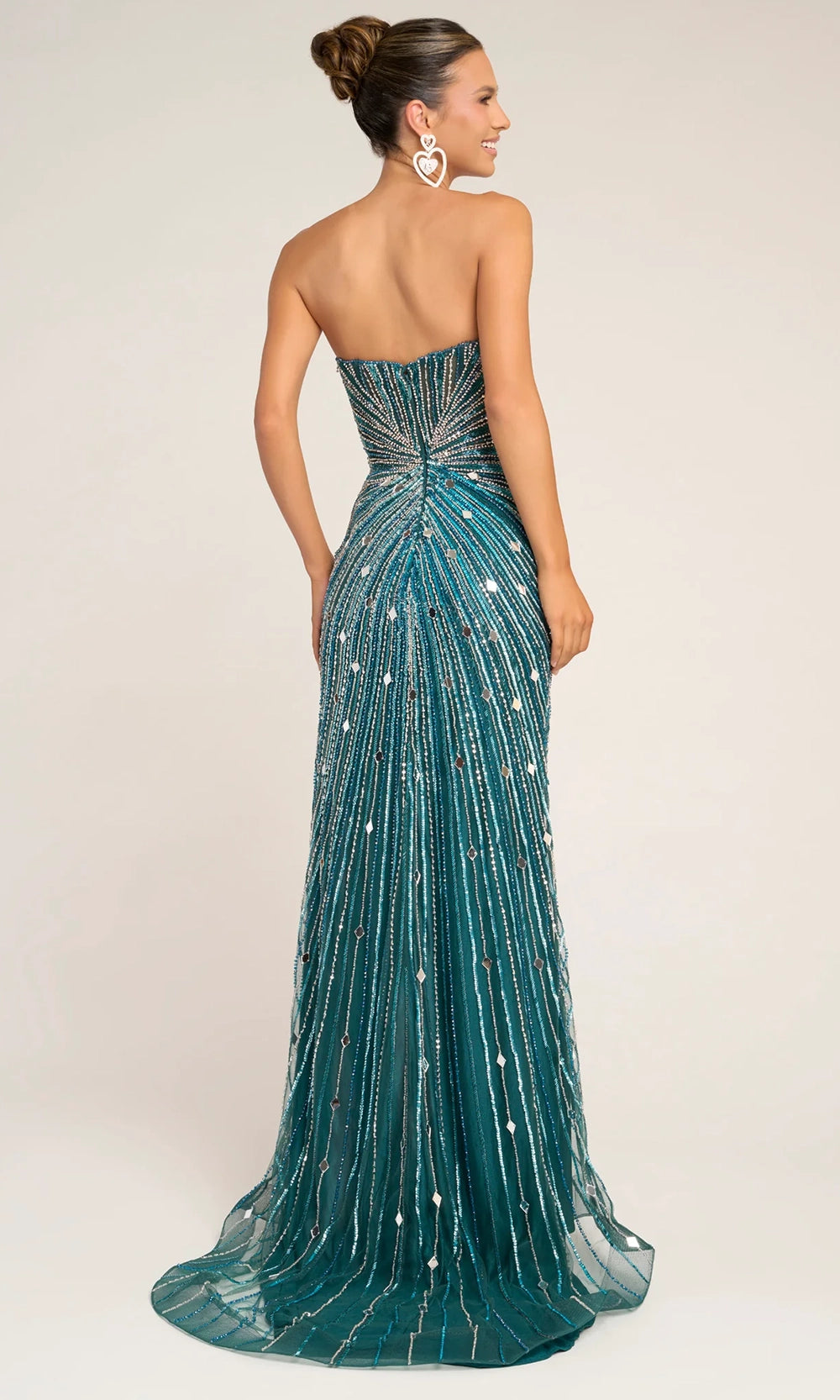 | Details: | Beaded, Mirrored Embellishments, Strapless, High Slit, Mid-Open Back, Horsehair Hem |