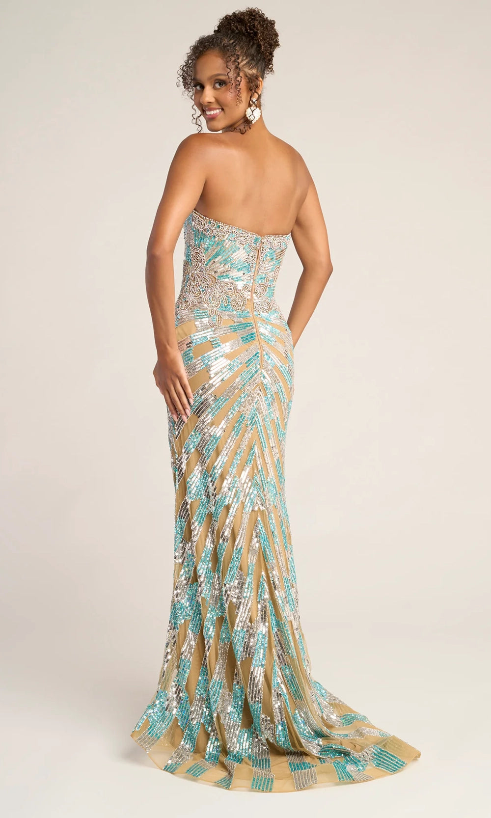 | Details: | Beaded, Shimmer Embellishments, Strapless, High Slit, Hidden Back Zipper, Fitted Bodice |