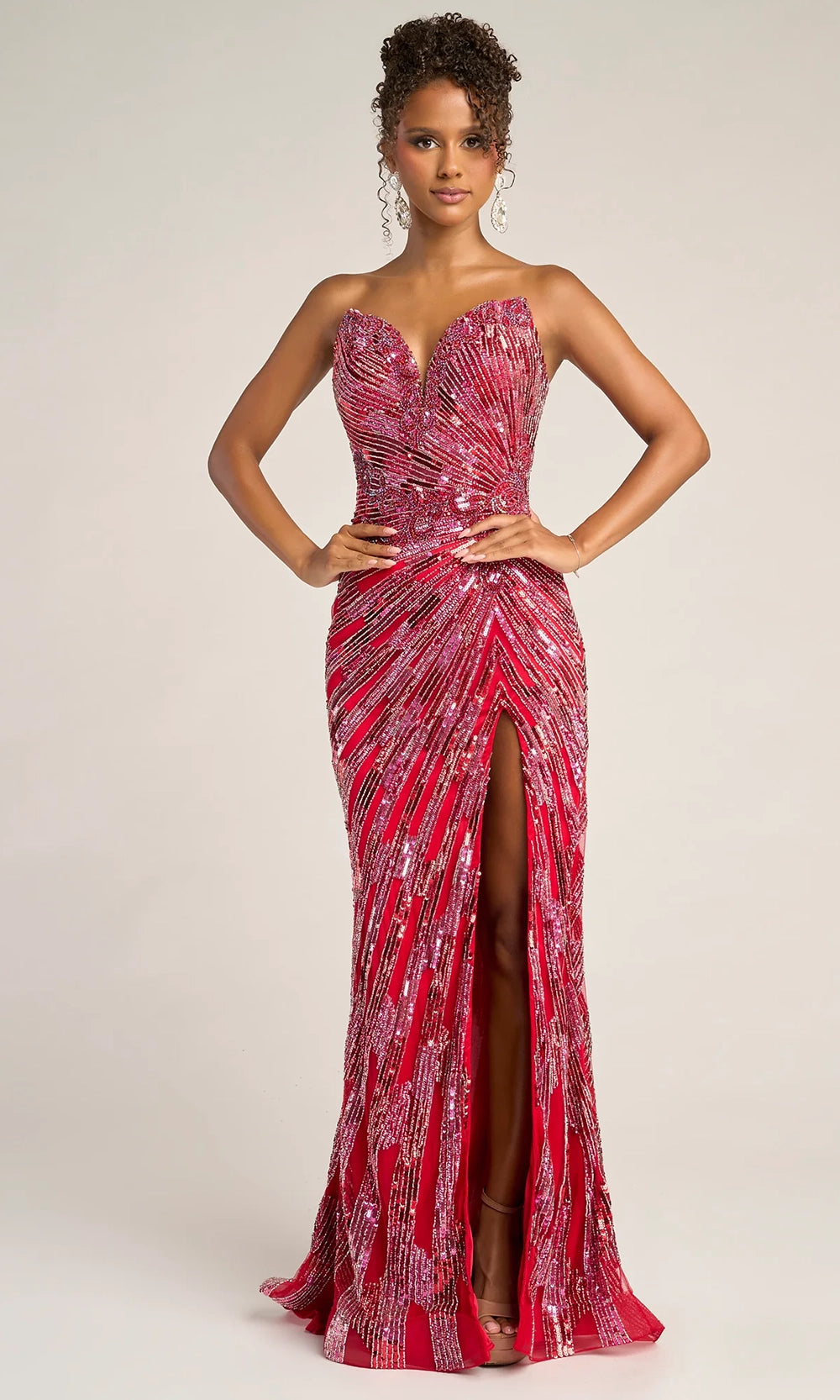 Portia and Scarlett PS26413C is a captivating sheath piece that combines radiant sparkle with flattering design. The strapless v-neckline gracefully enhances the decolletage, while a sculpted bodice with delicate ruching cinches the waist. Allover shimmer embellishments in a dynamic arrangement deliver maximum shine, complemented by a dramatic thigh-high slit for movement and confidence. The fitted silhouette creates a seamless line from bust to hem, ensuring a sleek and polished look throughout the evening. Portia and Scarlett PS26413C is the perfect choice for the woman who embraces glamour with sophistication. Models are wearing Black/Fuchsia, Gold, Lilac, Nude/Blue/Silver, Peacock, Pink, Red/Fuchsia, and Silver colors.