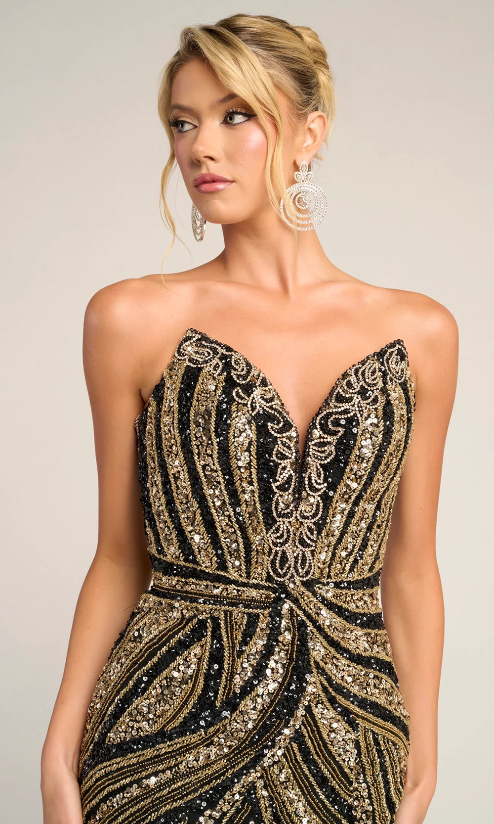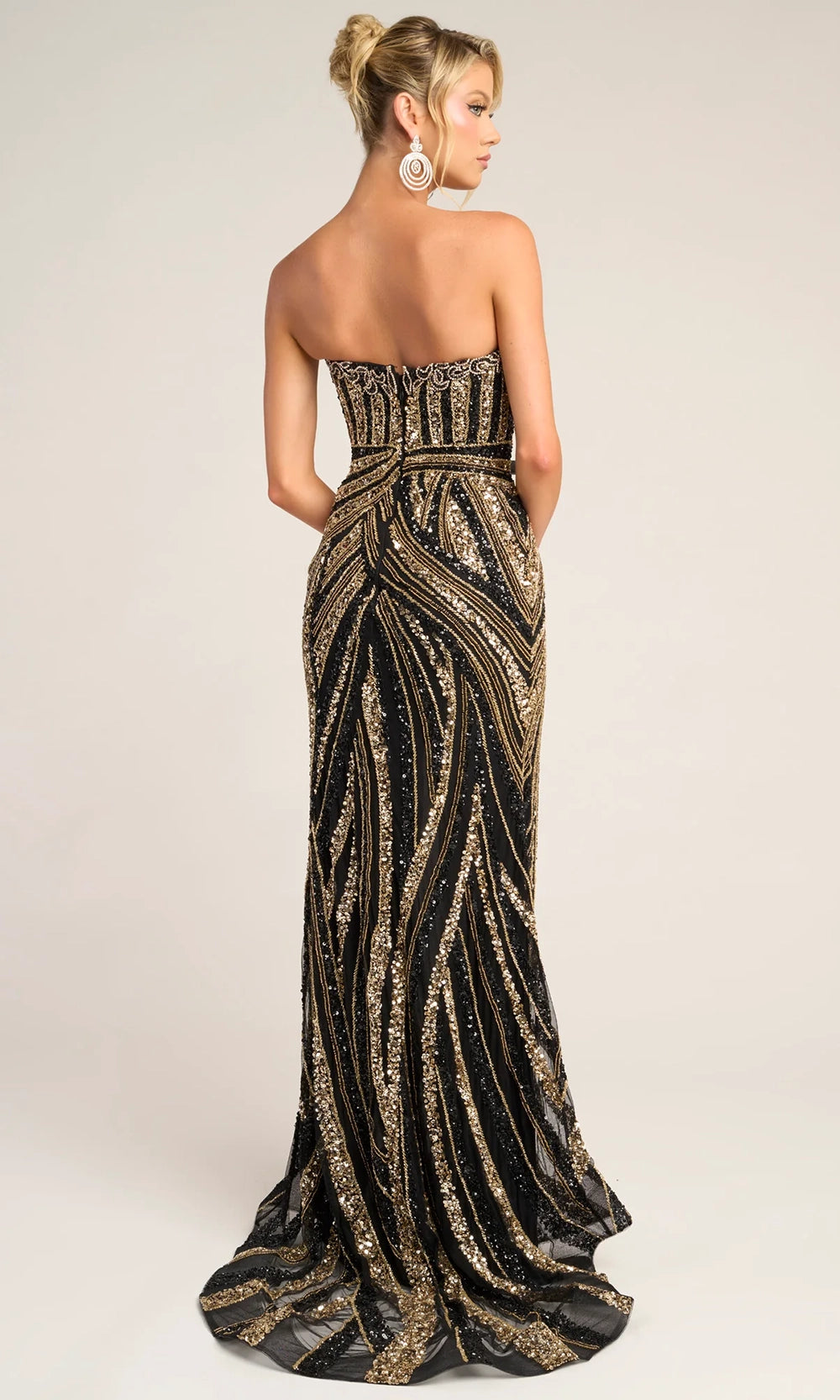 | Details: | Strapless, Beaded, Shimmer Embellishments, High Slit, Mid-Open Back, Fitted Bodice |