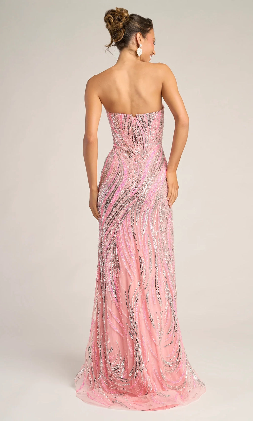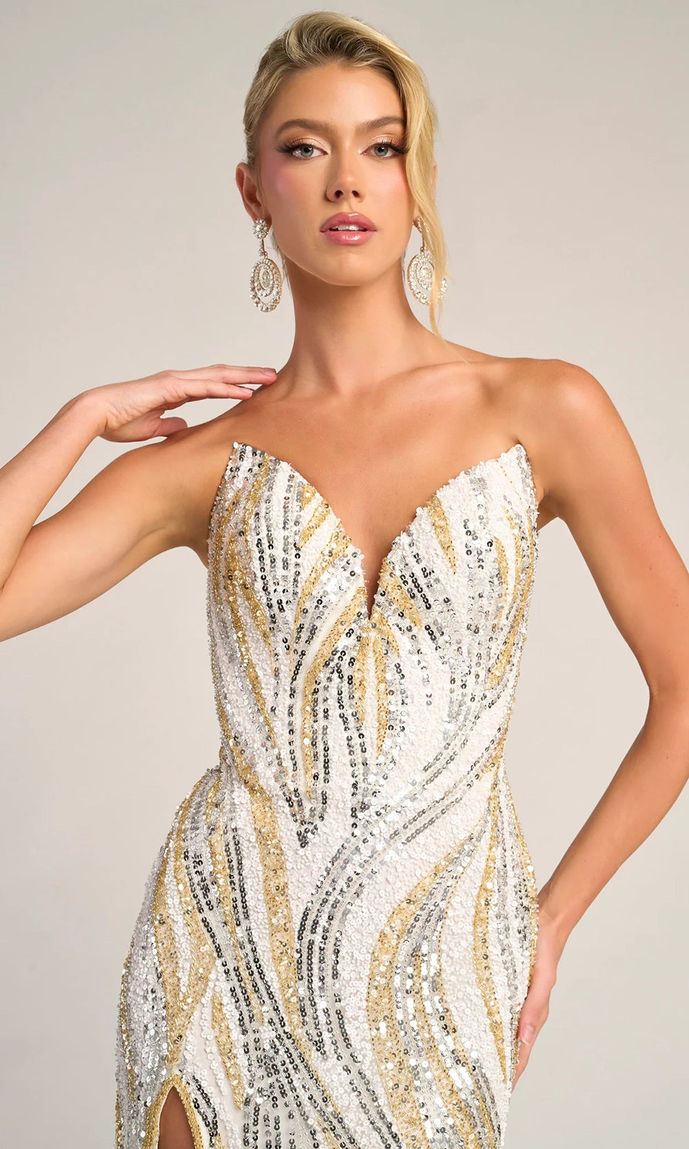| Details: | Shimmering Accents, Fitted Bodice, Strapless, Side Slit, Hidden Back Zipper |