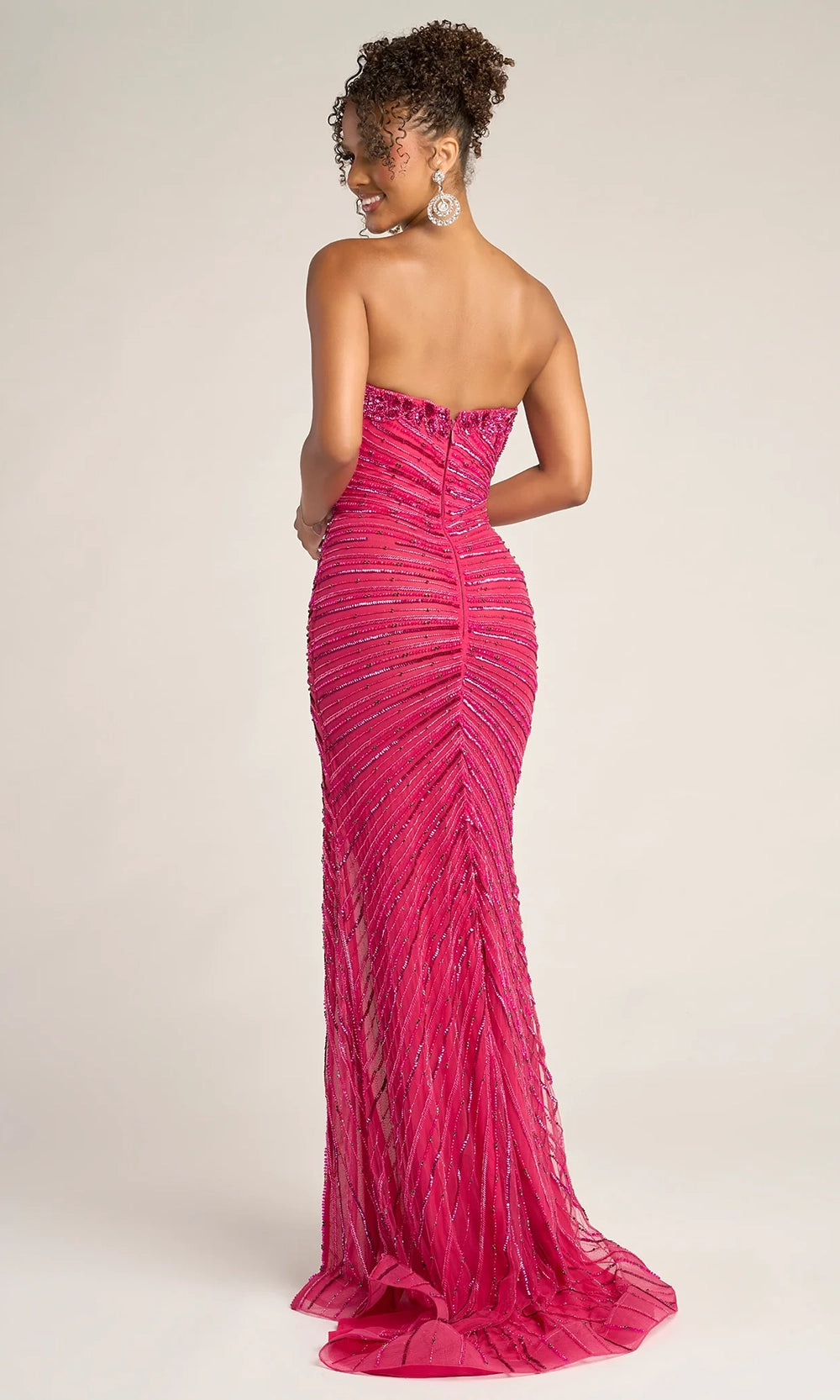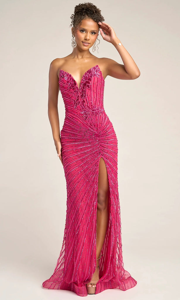 Capture attention from every angle in Portia and Scarlett PS26422C masterpiece. Fashioned with a structured fitted bodice and shimmering embellishments, this strapless ensemble flatters the figure with a carefully sculpted shape and alluring deep v-neckline. A high slit in the sheath skirt enhances movement while lending a touch of bold appeal. The intricate beadwork and thoughtful placement of design details come together to create a luxurious finish. Embrace head-turning sophistication with Portia and Scarlett PS26422C dress. Models are wearing Fuchsia, Nude/Silver/Ivory Pearl, and Rose Gold.