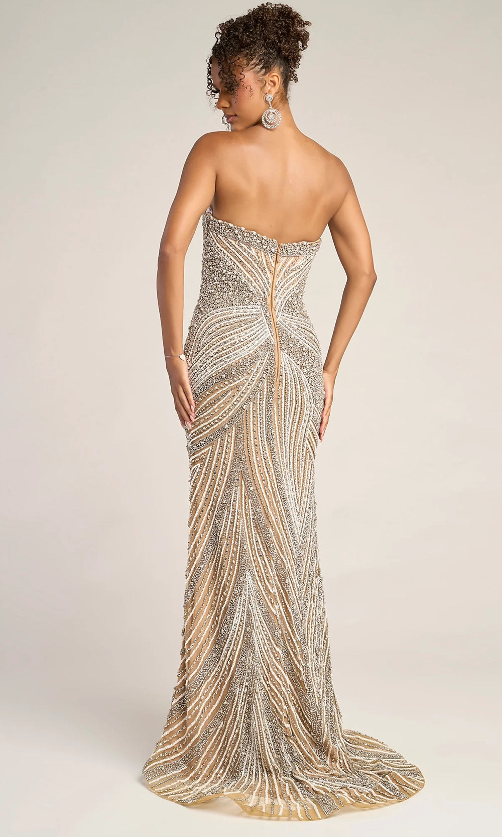 | Details: | Strapless, Body-Hugging Fit, Crystal Beaded, High Slit, Concealed Back Zipper |