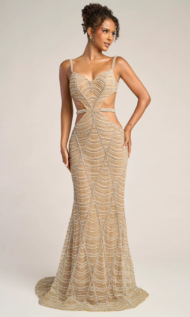 Portia and Scarlett PS26455C offers a fresh take on vintage glamour through its modern silhouette and intricate Art Deco beading. Featuring a structured v-neckline and slender shoulder straps, this gown is elevated by its double side cutouts that reveal just the right amount of skin. The pattern visually elongates the body and accentuates the hourglass shape, finishing in a sleek sheath silhouette with a sweep train. Turn moments into memories in Portia and Scarlett PS26455C, where ornate detail and contemporary elegance come together flawlessly. Model is wearing Gold color.
