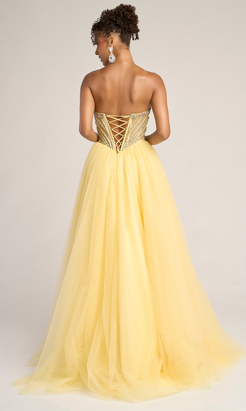 Radiance takes shape in Portia and Scarlett XO047, a dress that merges structured detail with soft volume. The strapless corset-style bodice is intricately embellished, creating a fitted look that transitions into a flowing A-line skirt. A touch of sparkle across the bodice brings attention to the upper silhouette, while the scoop neckline and lace-up back maintains an ethereal charm. Perfect for grand occasions, Portia and Scarlett XO047 embodies the harmony of a flattering fit and a graceful profile, offering a timeless impression from every angle. Model is wearing Yellow color.