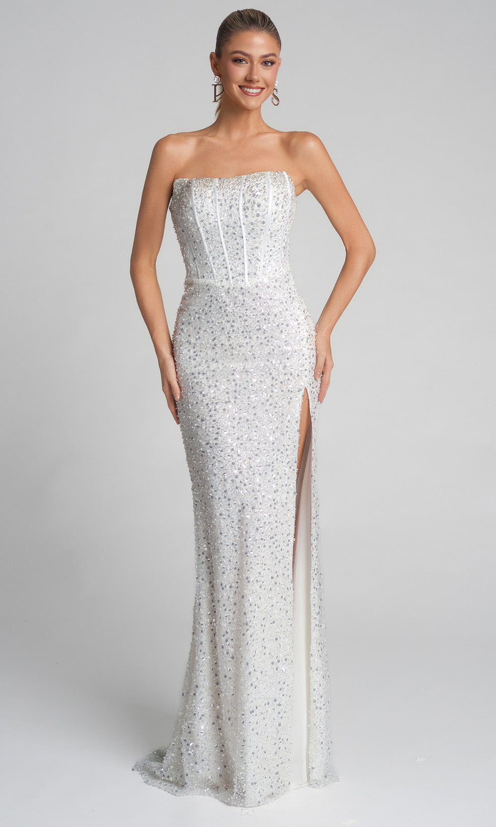 Shine from every angle in the dazzling Portia and Scarlett XO054 creation. This sheath dress features a strapless corset bodice that molds beautifully to the figure with a shimmering accents. Draped off-shoulder strands add whimsical detail, while the thigh-high slit reveals a modern, sultry edge. The structure of the fitted sheath silhouette flows effortlessly into a graceful hem, making it a stunning choice for any formal event. Step into full glam mode with the unforgettable Portia and Scarlett XO054. Models are wearing Pink, and Ivory colors.