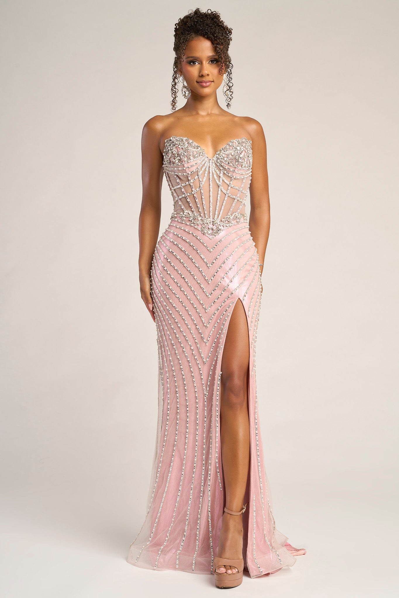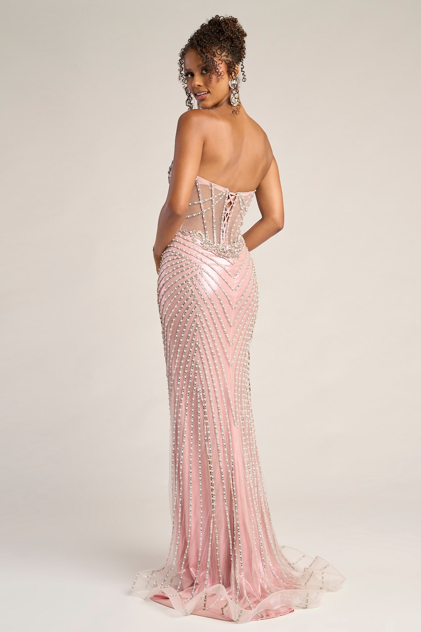 | Details: | Strapless, Sheer Corset Bodice, Beaded Chevron Pattern, High Slit, Lace-Up Back |