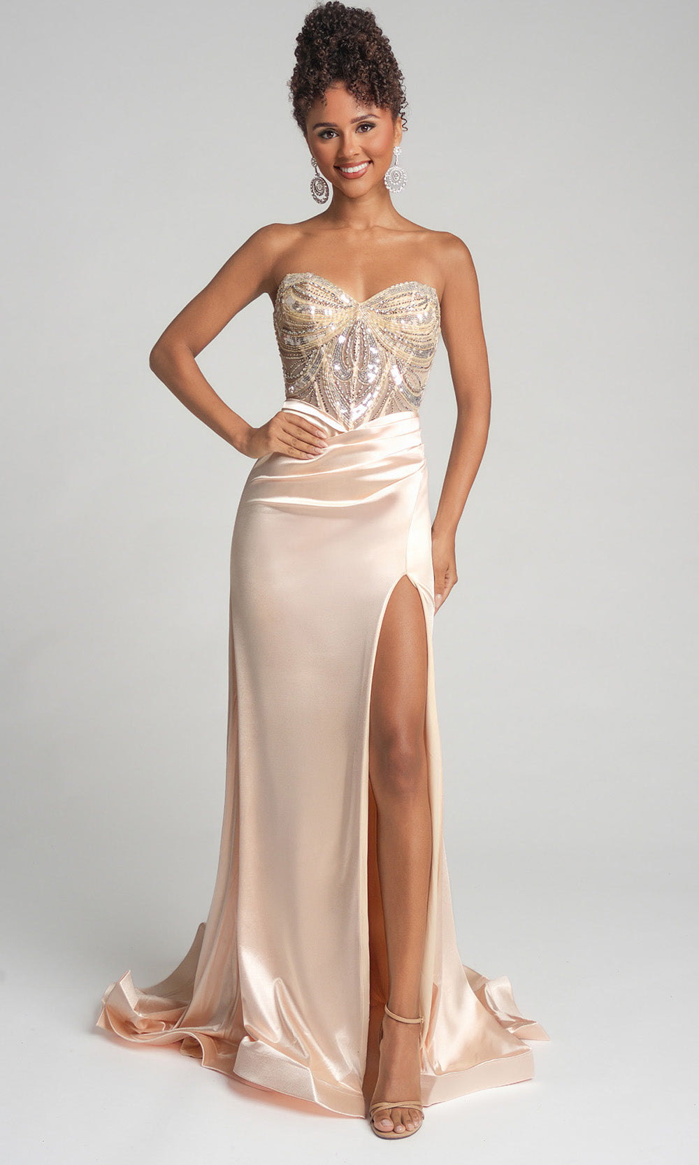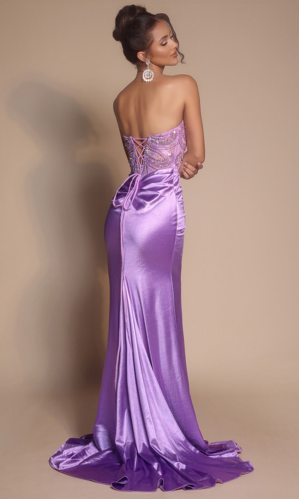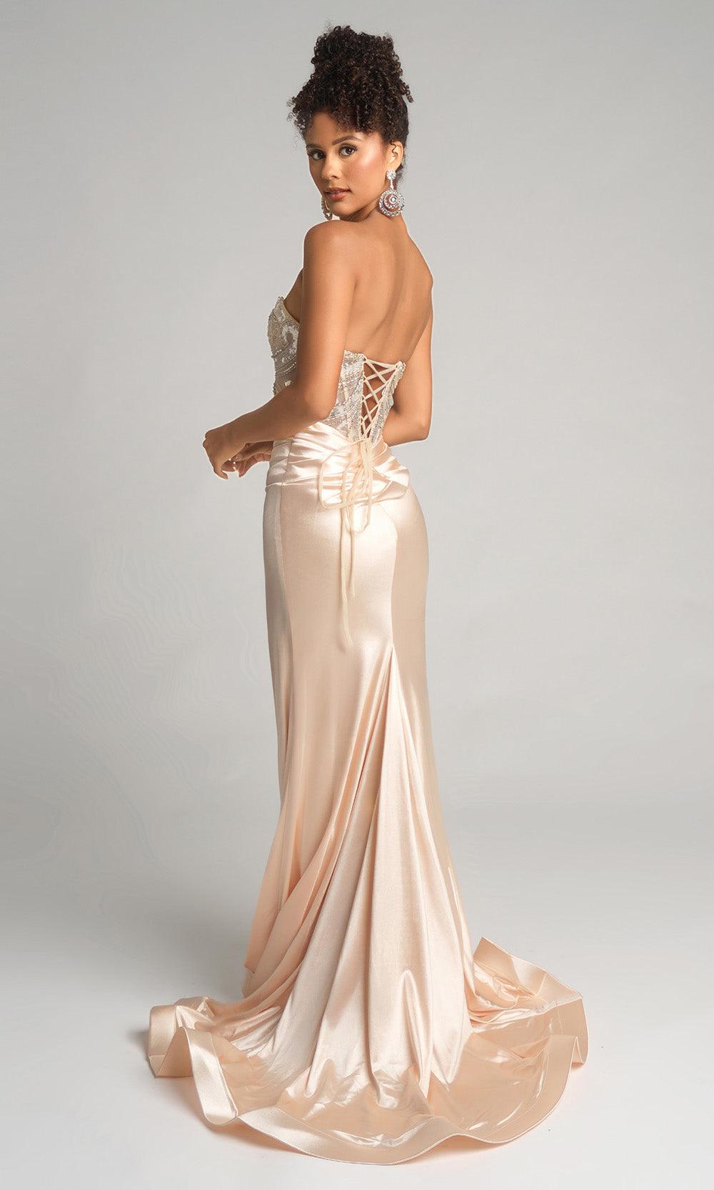 | Details: | Strapless Design, Lace-Up Back, Beaded Corset Bodice, High Slit, Fitted |