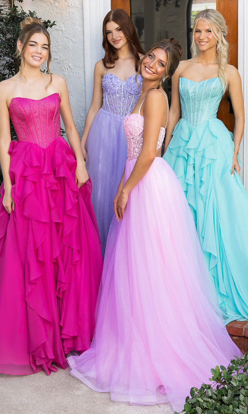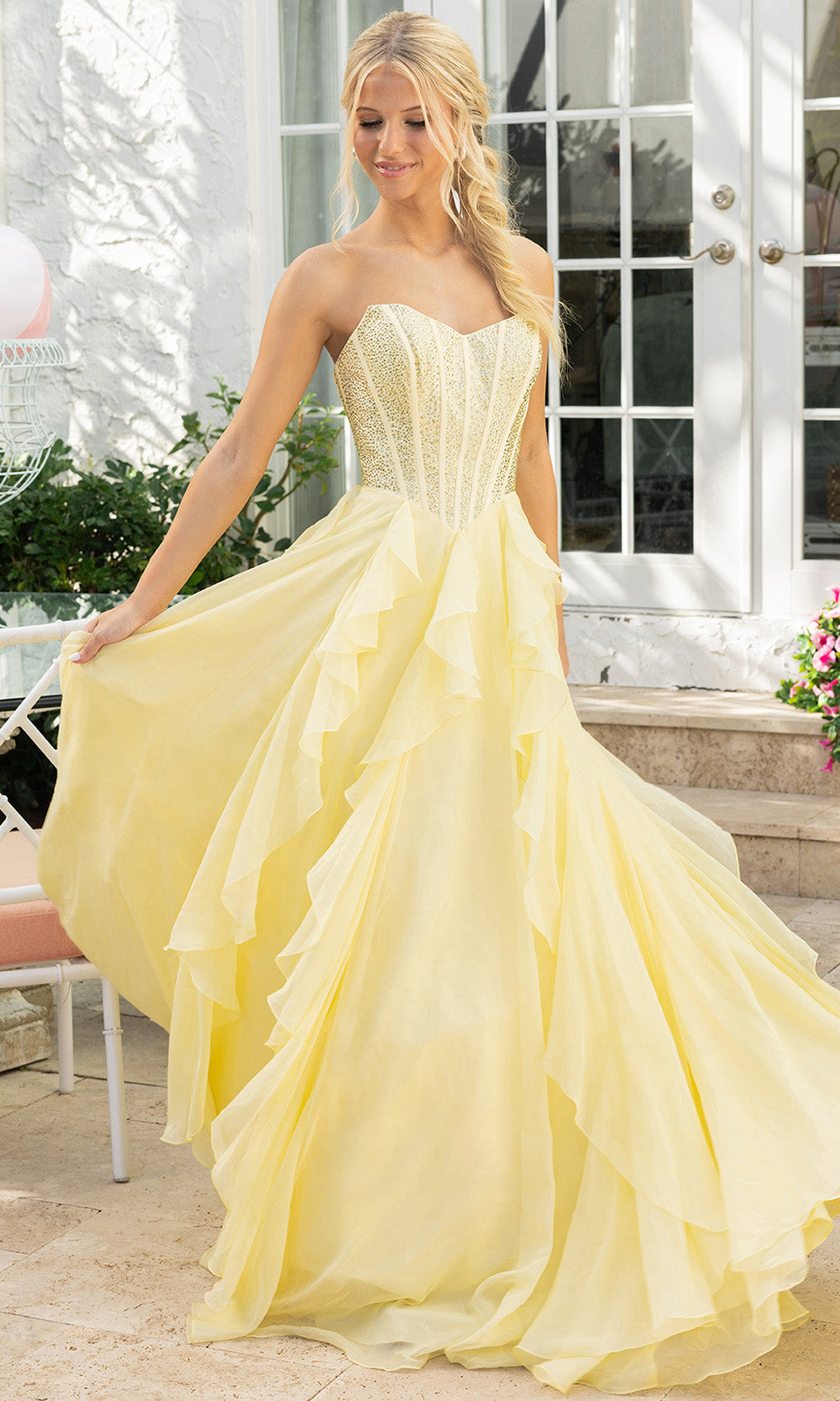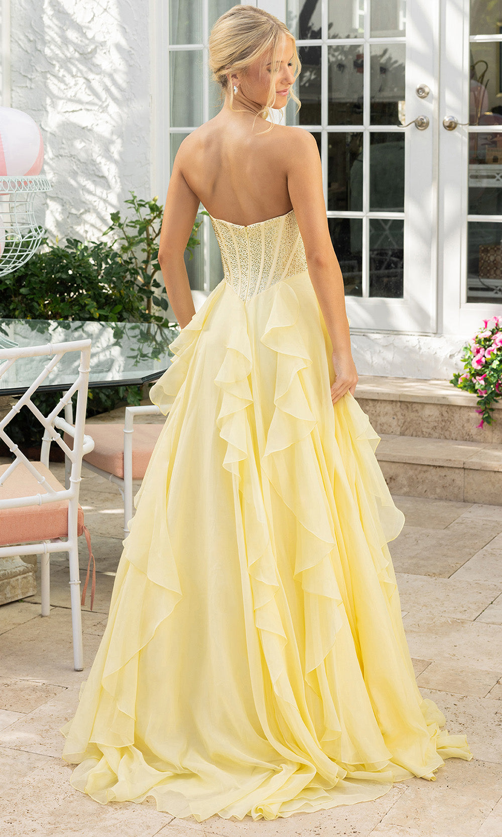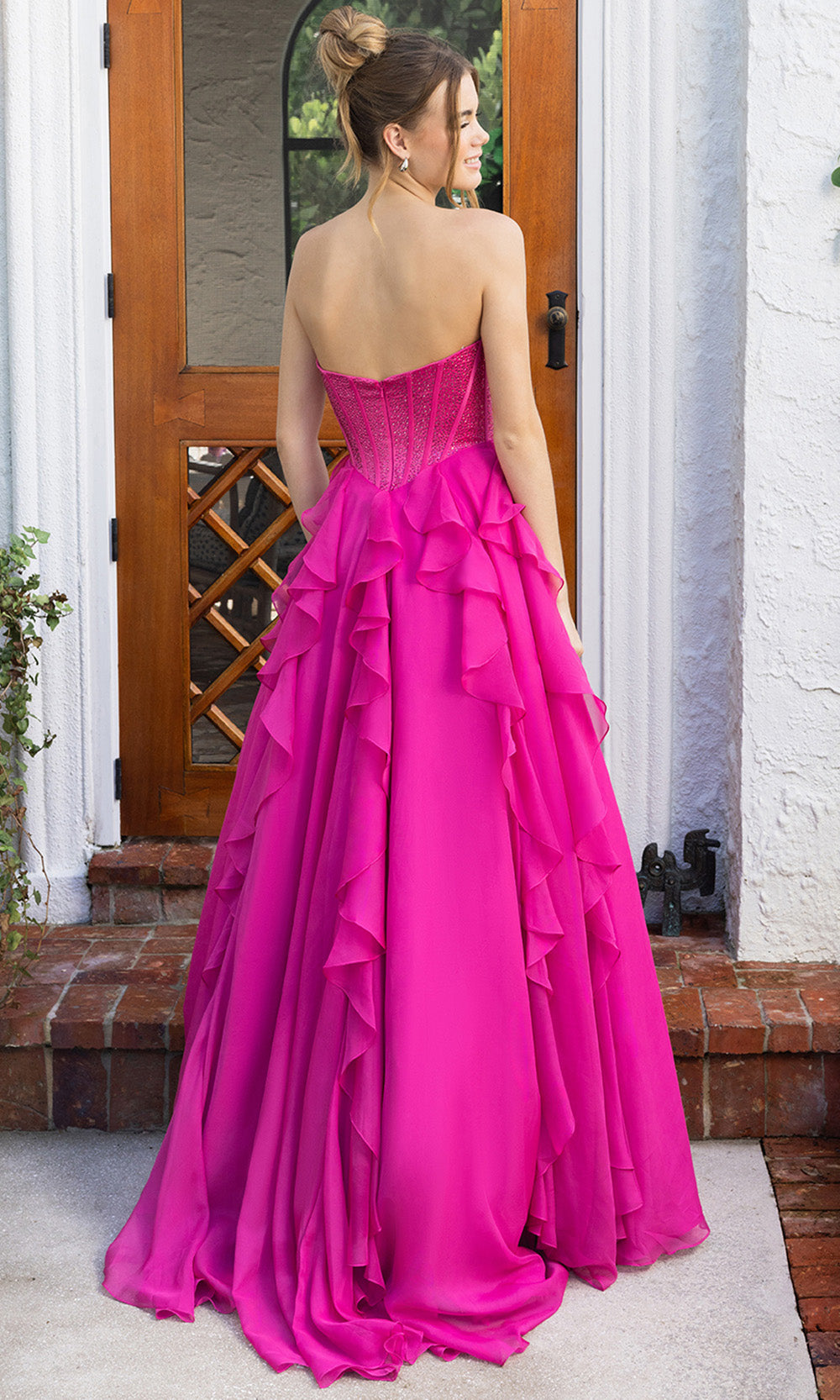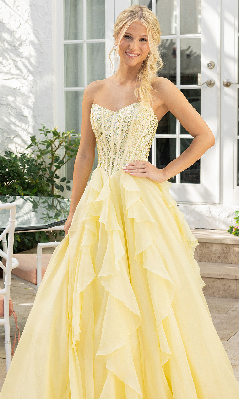 Indulge in storybook glamour with Portia and Scarlett XO174, a gown that enchants from the very first glance. The structured strapless corset bodice, complete with visible boning, highlights a peaked sweetheart neckline with the perfect plunge, enhanced by sheer accents and shimmering details. A chic scoop mid-open back with concealed zipper adds modern allure. Flowing into a voluminous semi-ballgown skirt, soft ruffle overlays create graceful movement and romantic texture. Ideal for prom nights, pageants, or grand galas, XO174 embodies timeless elegance with captivating beauty. Dress is pictured in Fuchsia, Mint, Yellow variants.