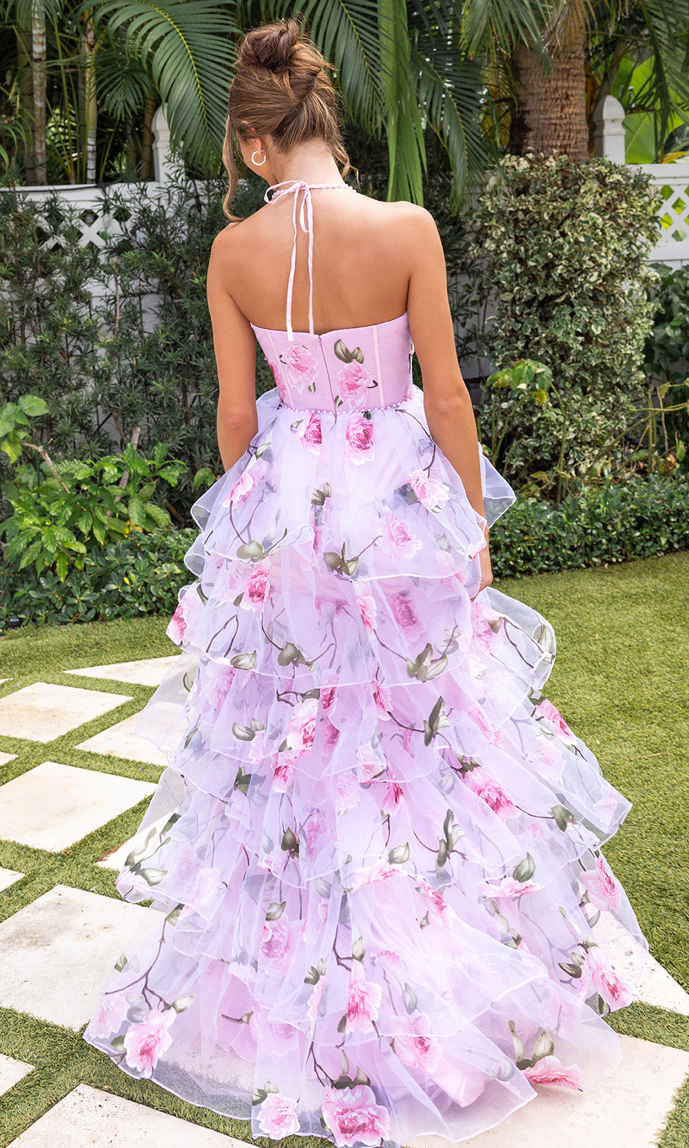 Portia and Scarlett XO176 is a gown that blooms with romance and ethereal charm. The structured corset bodice sculpts the silhouette with precision, while a halter plunging V neckline adorned with delicate pearl details frames the decolletage with luminous elegance. Cascading layers of soft ruffles create a tiered, voluminous skirt, crafted from floral-printed organza that moves with enchanting fluidity. A tie-back detail ensures a tailored finish, while the captivating front leg slit adds modern allure. XO176 is the perfect blend of femininity and drama, ideal for galas, pageants, or red-carpet occasions. Dress is pictured in Pink variant.