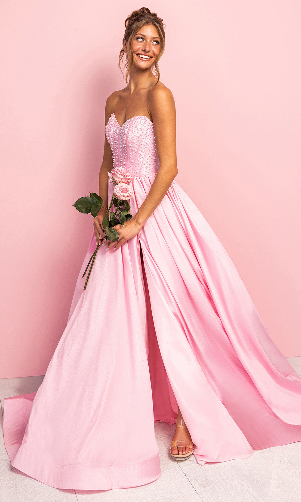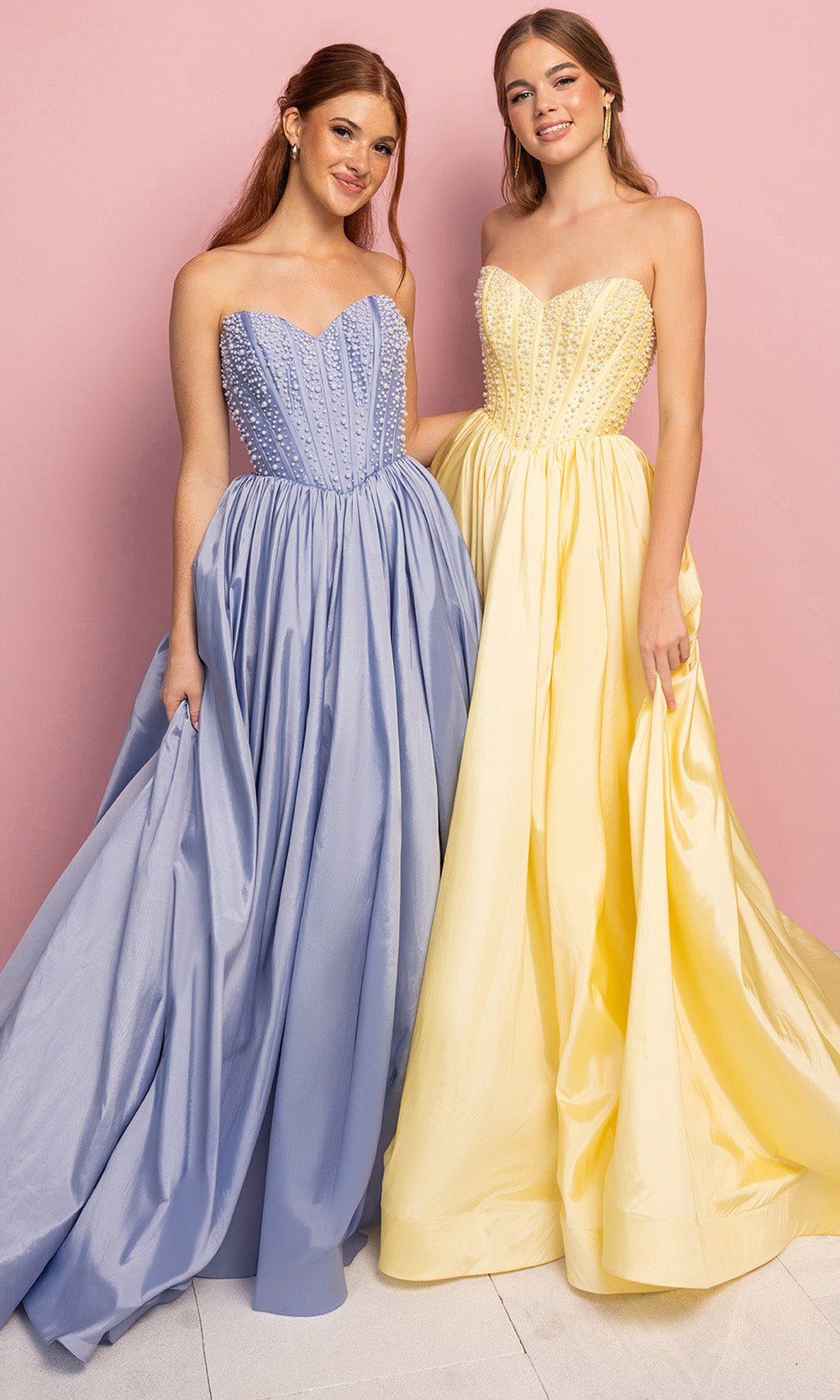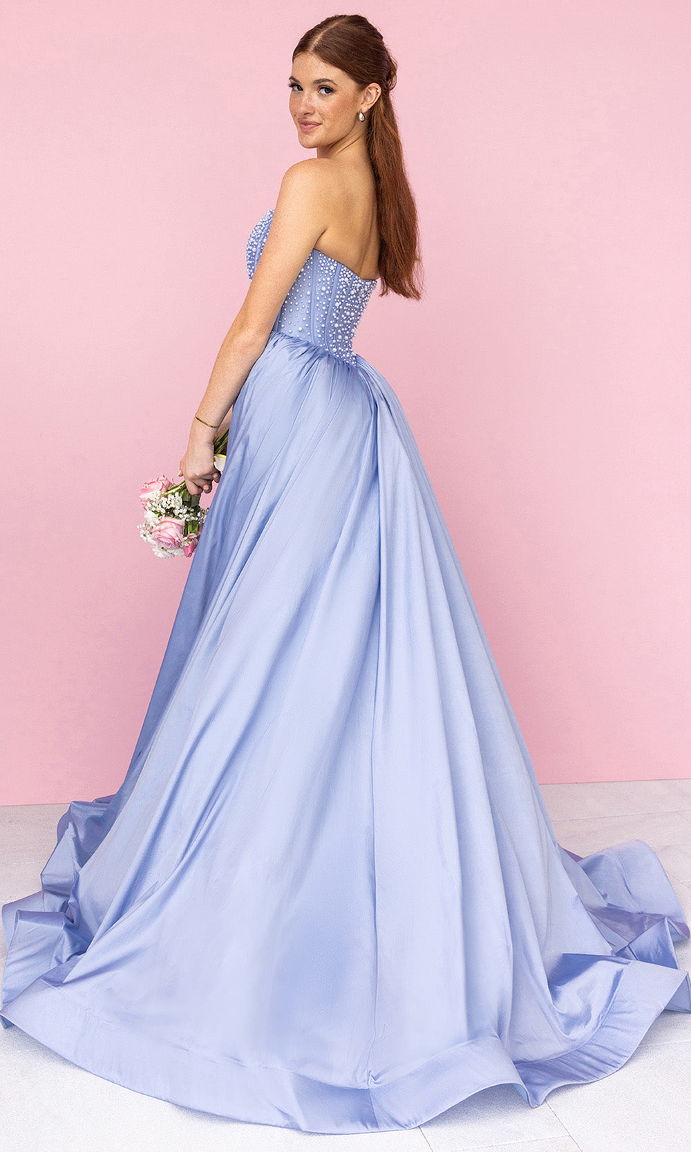 Make an unforgettable entrance in Portia and Scarlett XO178, a gown that blends timeless elegance with modern allure. The strapless corset bodice, adorned with delicate bead detailing, adds subtle texture and sophistication. Flowing into a full A-line skirt with a daring high slit, this design balances structure with fluidity. A pleated Basque waist enhances the silhouette, while the semi-open back with center zip ensures a flawless fit. Finished with a sweeping train, Portia and Scarlett XO178 is perfect for prom, evening galas, or glamorous celebrations. Dress is pictured in Black, Mint, Periwinkle, Pink, and Yellow variants.