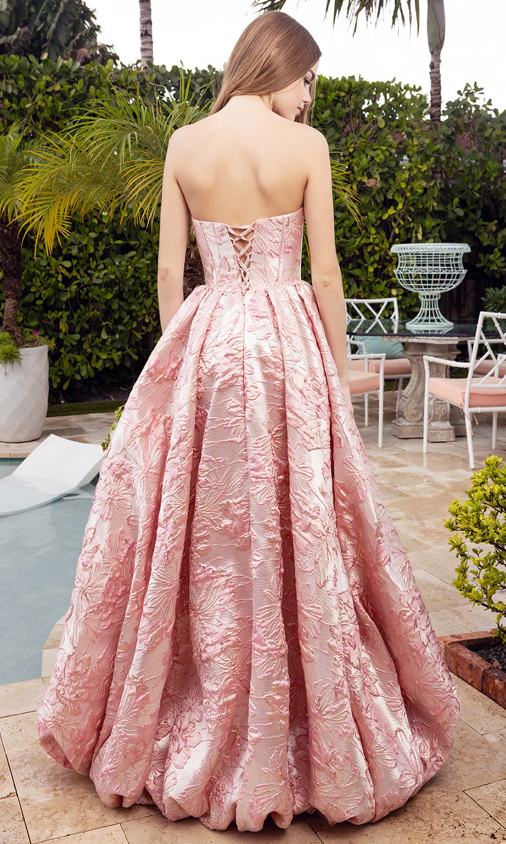 Grace the occasion in Portia and Scarlett XO180, a gown that seamlessly blends structure with fluid elegance. The fitted corset bodice, detailed with delicate boning, sculpts the figure while the lace-up back adds a romantic finish. Flowing into a semi-ballgown skirt, the silhouette offers graceful volume and texture, enhanced by the luminous sheen of floral-patterned jacquard. Designed to move effortlessly with every step, XO180 captures both charm and modern refinement. Perfect for formal events, this gown embodies timeless sophistication with a youthful spirit that leaves a lasting impression. Dress is pictured in Pink variant.