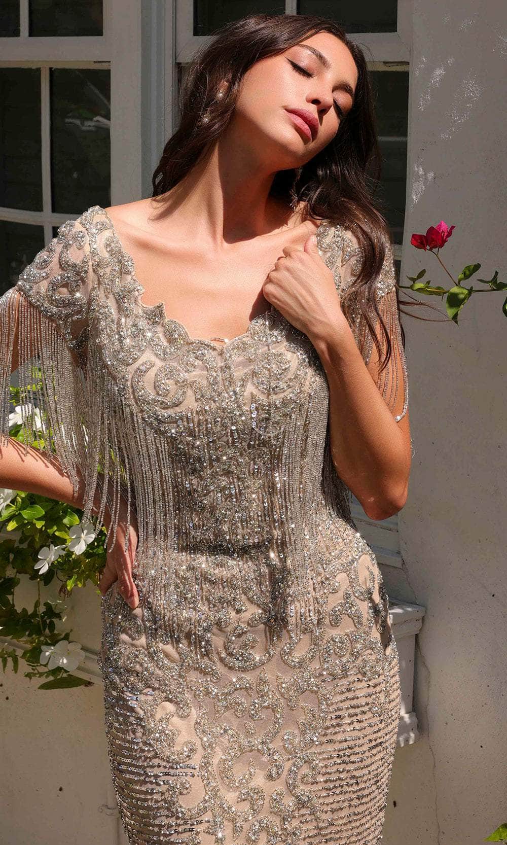 Strike a pose as you enter the red carpet in this Primavera Couture 12152 masterpiece. Luxuriously ornamented with a combination of beadworks, sequins, and playful fringes, the dress gives off a stylish and radiant appearance. The short sleeves beautifully frame the shoulders, while the v-neckline and mid-open v-shaped back have mesmerizing scalloped details. The skirt embraces your curves thanks to its sheath silhouette and it culminates in a mini train. Captivate the crowd wearing this exceptional Primavera Couture 12152 gown. Models are wearing the Blush Silver, and Pewter colors.
