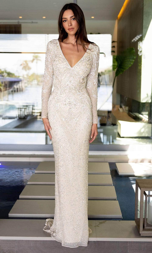 Details: Long Sleeve, Beaded, Sequin, V-Back, Back Zipper, Sweep Train, Fitted