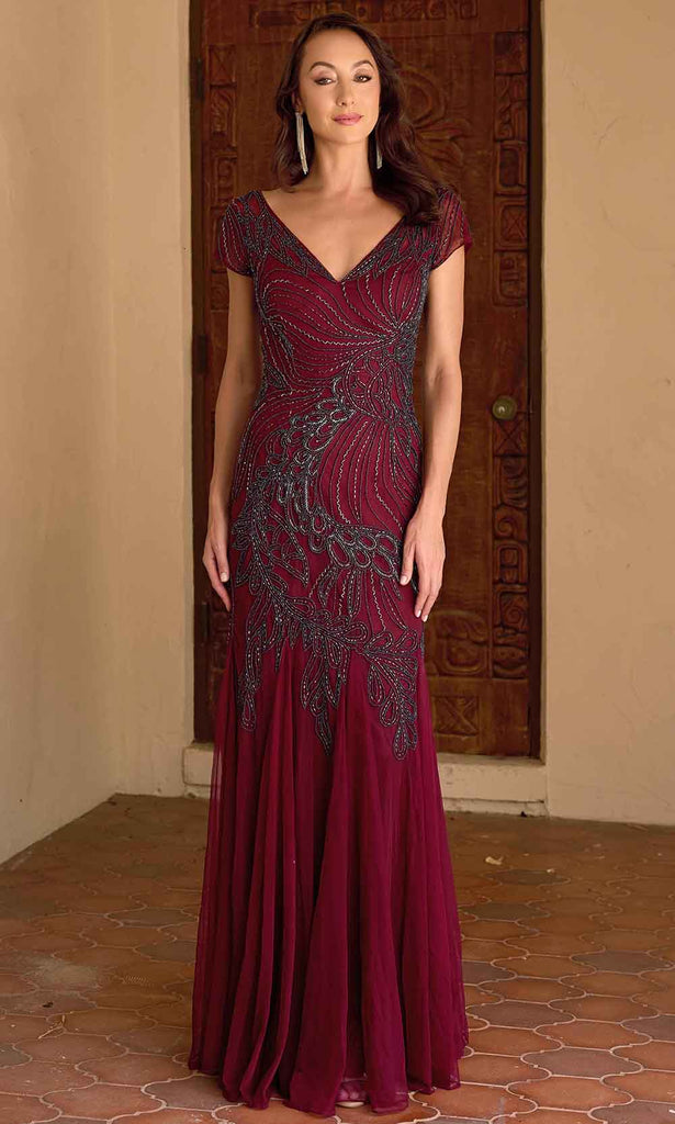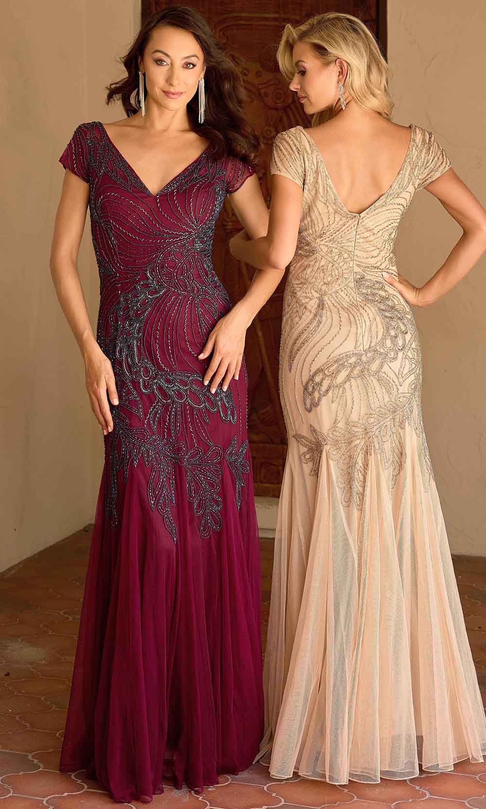 Look and feel glamorous with this Primavera Couture 13148 gown. This stunning masterpiece is fully embellished with intricate beadwork, creating a dazzling effect that captures every light. The gown features chic short sleeves and a flattering V-neckline that seamlessly transitions into a V-shaped back, offering a blend of timeless charm and modern sophistication. A concealed zipper closure ensures a perfect fit, highlighting your silhouette beautifully. The floor-length skirt parades in a sleek sheath silhouette, accented with delicate tulle that adds movement and grace. Ideal for formal occasions, this Primavera Couture 13148 combines classic beauty with contemporary allure, ensuring you make a memorable entrance. Models are wearing Wine and Caramel colors.
