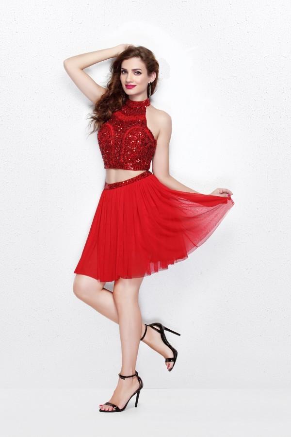 This alluring two-piece cocktail dress showcases a halter neckline with racer back for a sporty yet sassy vibe. A mixture of brilliant beads and sequins festooned the crop top with exciting cut-out at the back. Matching embellishments wrap the fitted waist with layered skirt will definitely have you classified as fabulous.