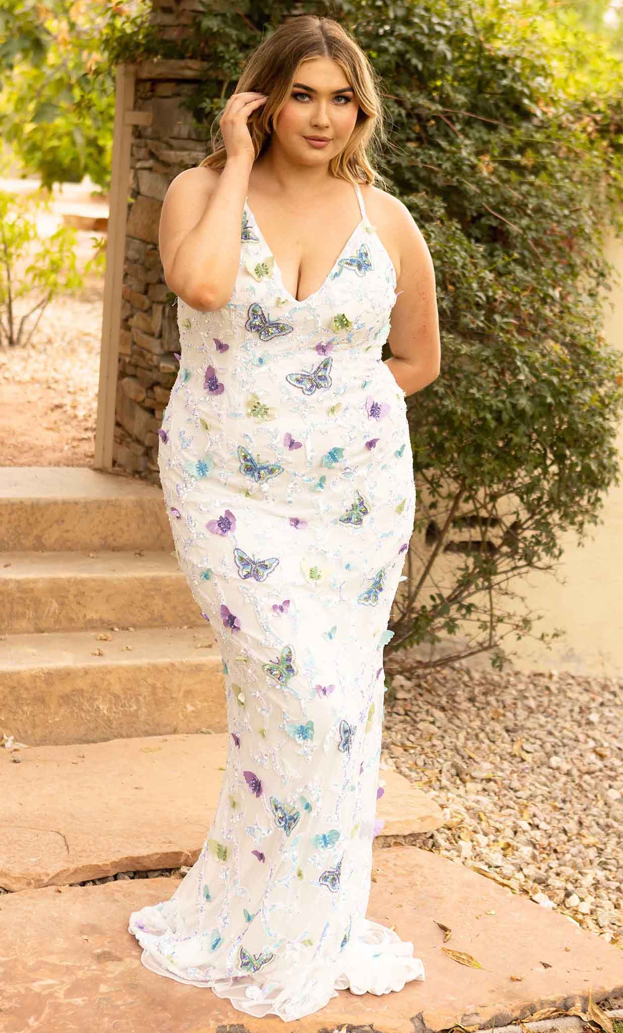 Appear like a modern princess with the unique beadwork of Primavera Couture 14003. This floor length gown has a classic sheath silhouette, adorned with varying butterfly appliques and sequin embellishments. It flaunes a plunging V-neckline and wire-thin straps that cross over at the back, showing off bare skin. The skirt also has a subtle sweep train. Dream to live a fairytale moment at your gala events? You will undoubtedly stand out on every occasion wearing Primavera Couture 14003. Models are wearing Ivory, Lilac and Powder Blue colors.