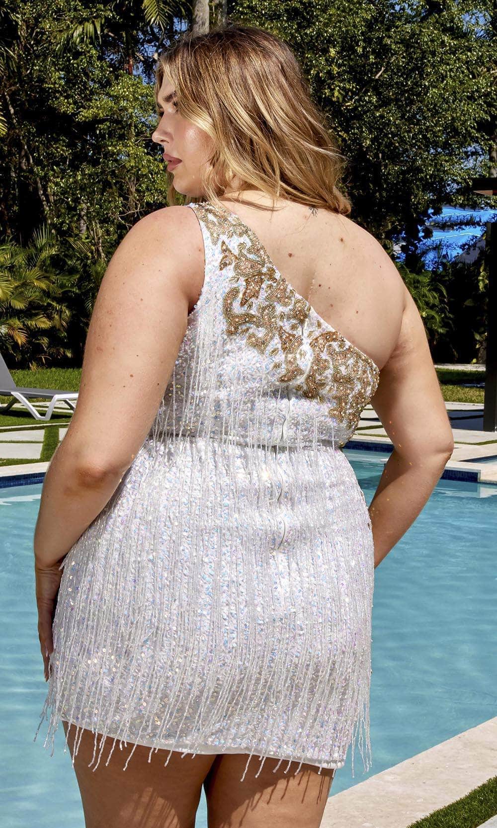 | Details: | Bead Embellished, One-Sleeve, Fringe Detail, Back Zipper Closure |