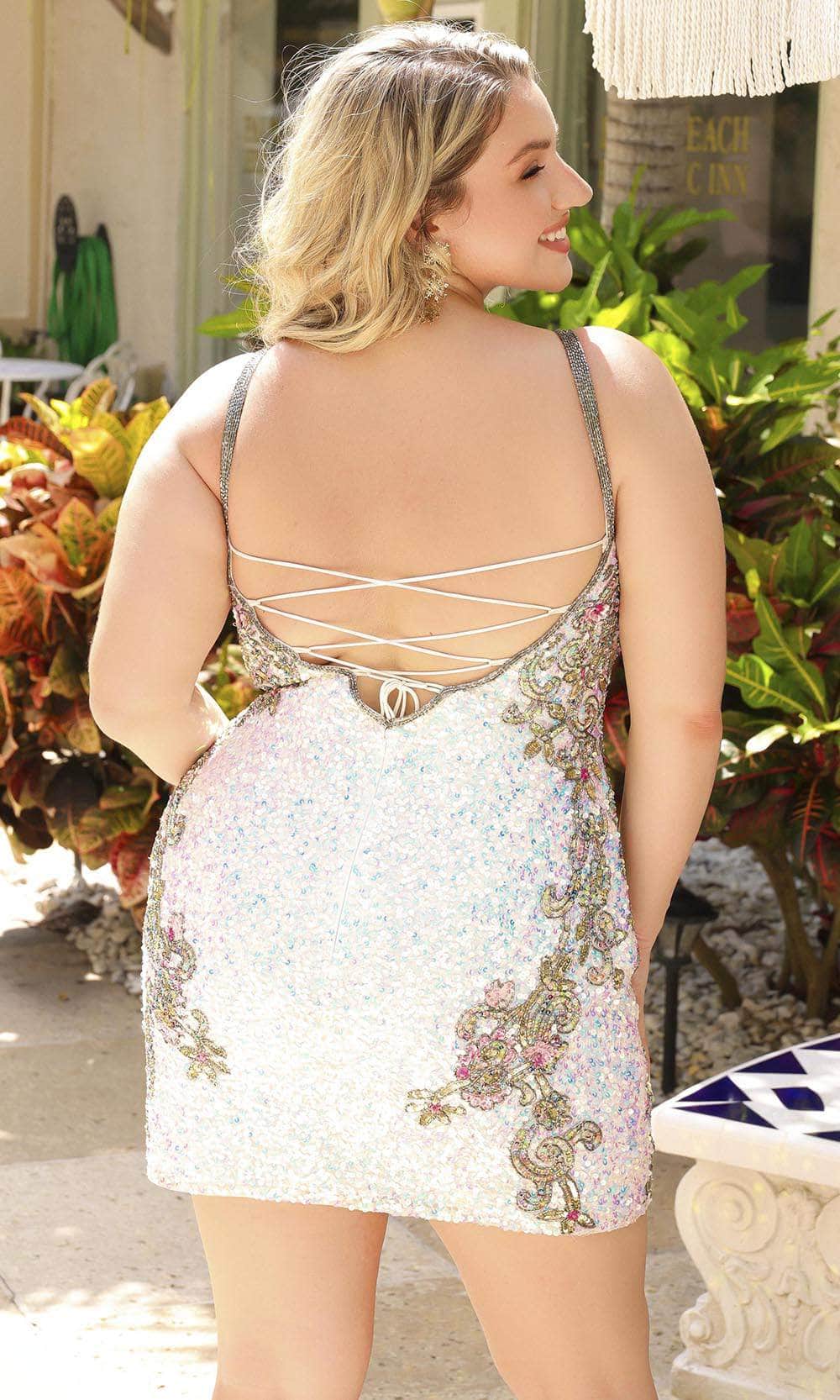 Unleash your inner radiance and embrace the epitome of elegance with Primavera Couture 14029. This mesmerizing cocktail dress is a true masterpiece, adorned with a dazzling array of sparkling sequins and multi-colored accents in an intricate pattern. The sleeveless fitted bodice, graced with a V-neckline, exudes timeless charm and sophistication. The open back, delicately tied with lace-up detail, adds a touch of allure. With a back zipper closure ensuring a perfect fit, the short-length sheath silhouette reveals a breathtaking display of confidence and beauty. Prepare to captivate hearts and make a lasting impression in this enchanting Primavera Couture 14029 creation. Models are wearing Black, Ivory, and Midnight colors.
