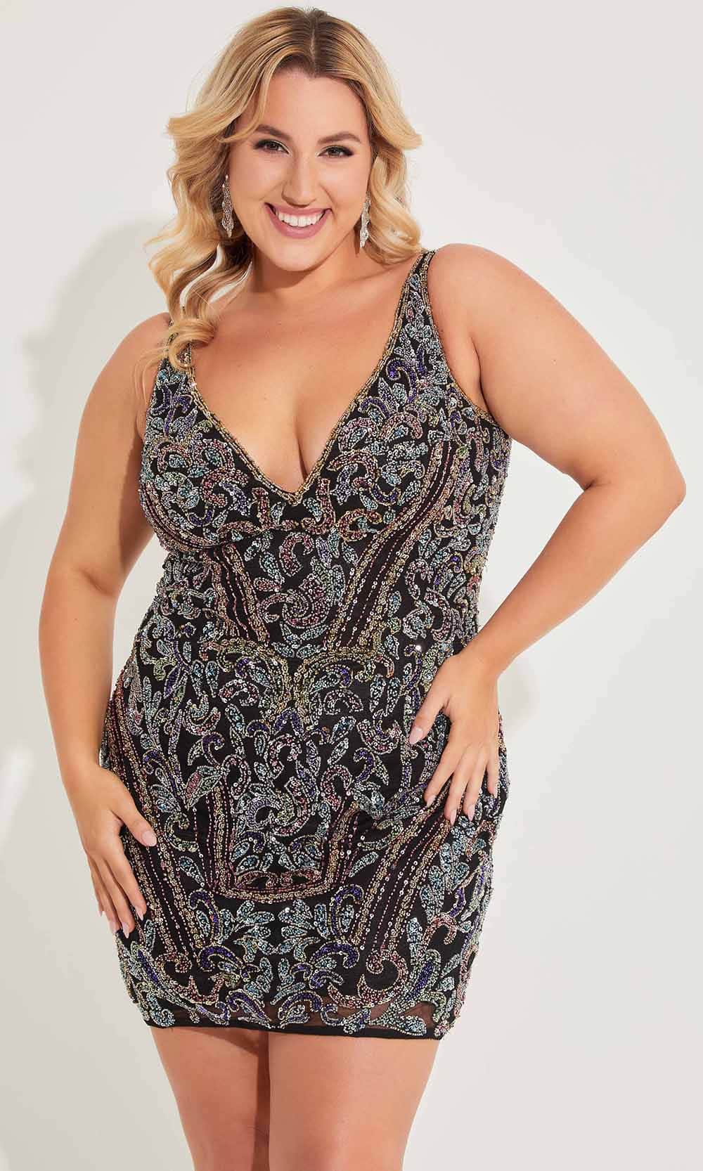 Orchestrate your moment to stand out in this Primavera Couture 14065, a dazzling stunner, adorned with sequins and beads. It features a sleeveless fitted bodice with a sophisticated V-neckline and a V-shaped open back, secured by a center zipper closure. The short-length skirt, designed in a sleek sheath silhouette, adds a touch of elegance and allure. Perfect for any special occasion, this Primavera Couture 14065 effortlessly combines glamour and sophistication, ensuring you make a memorable impression. Models are wearing Black, Ivory, and Midnight colors.