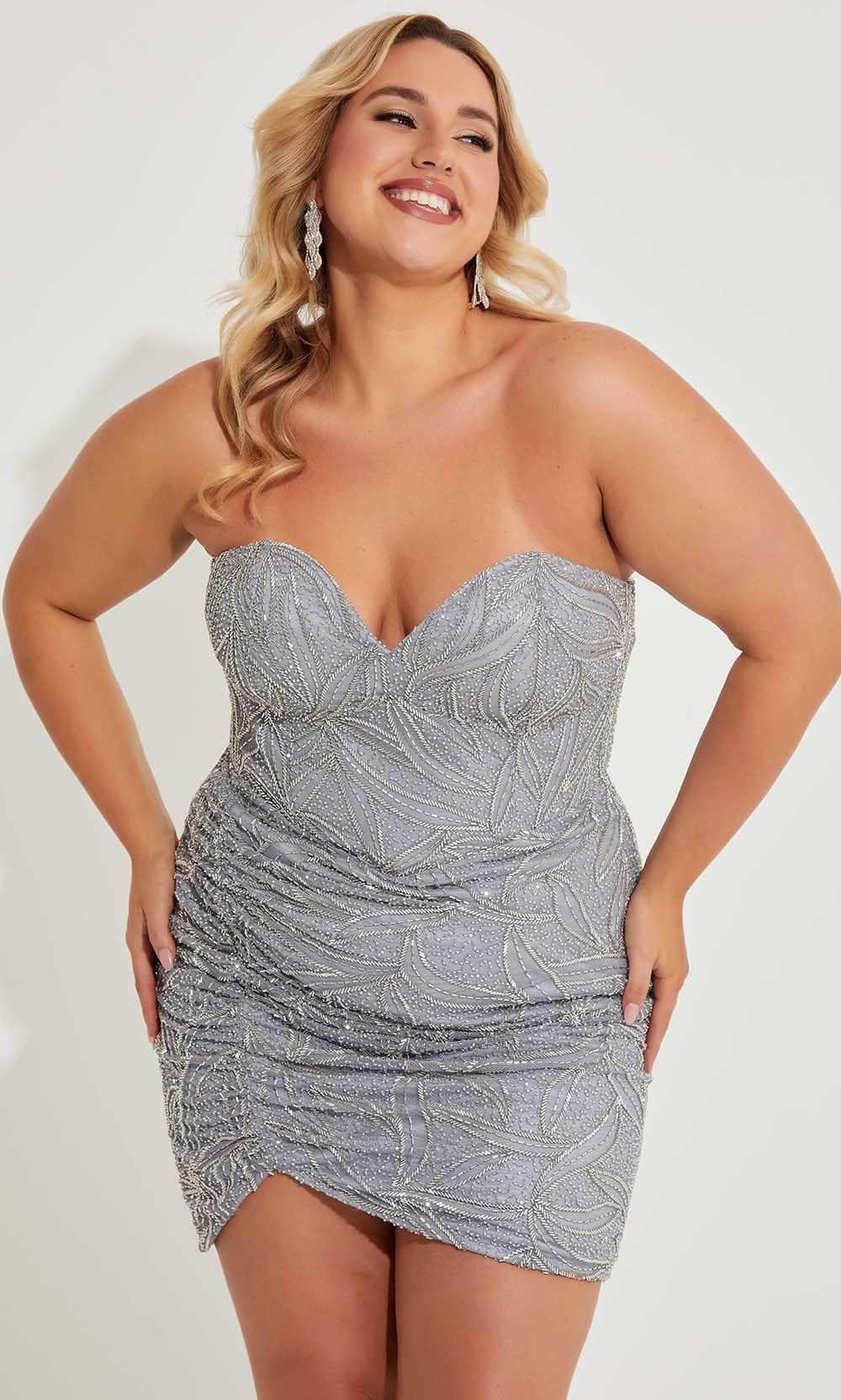 This Primavera Couture 14068, a breathtaking masterpiece embellished with delicate beadwork, will shine like gems under the bright lights. It has a strapless fitted bodice with a lovely sweetheart neckline that exudes elegance and attractiveness. A center zipper closing at the back provides a secure fit. The short-length skirt, with its sleek sheath silhouette, offers sophistication and style. This Primavera Couture 14068 is ideal for any special occasion, seamlessly combining glamour and timeless beauty. Models are wearing Black, Emerald, and Platinum colors.