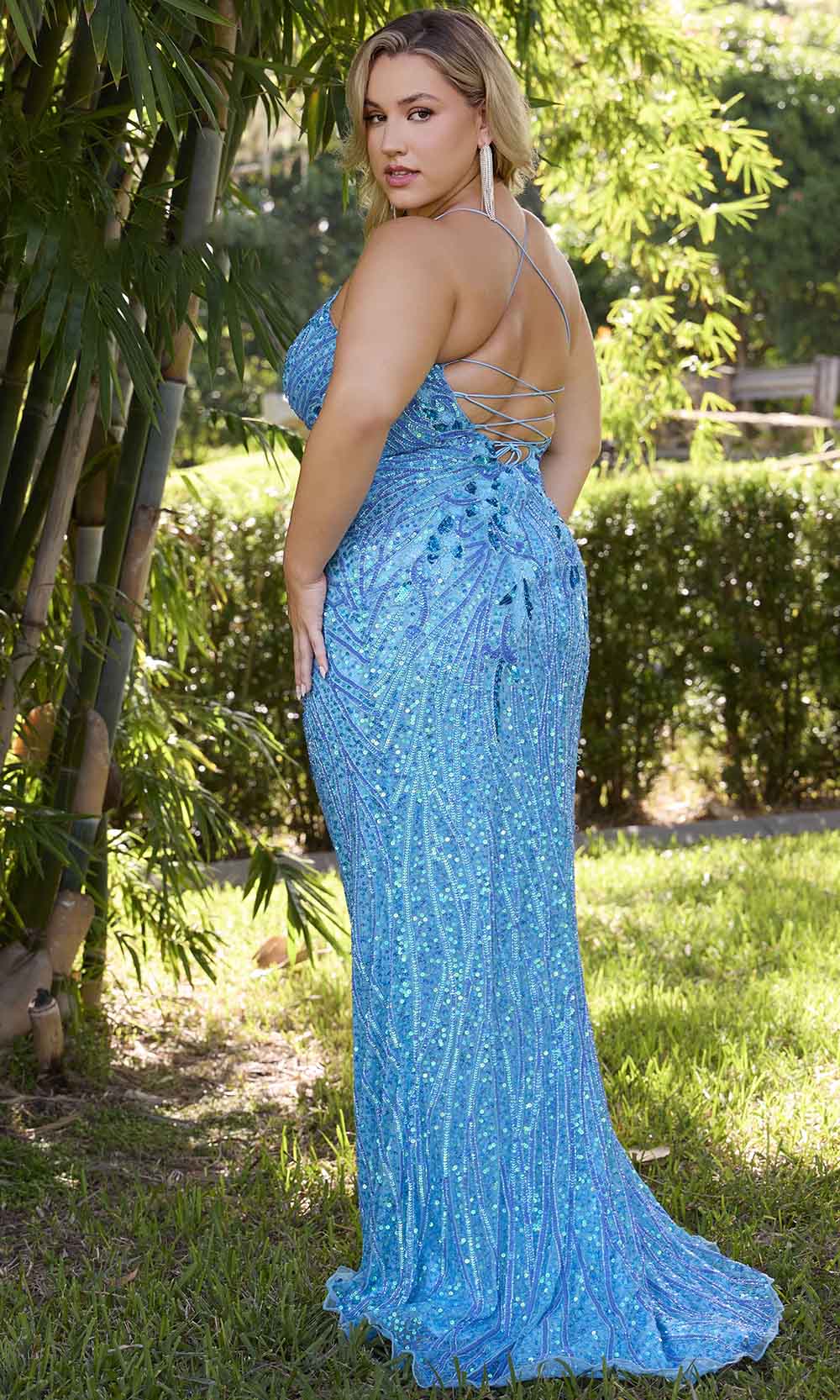 Shine with sophistication in the Primavera Couture 14072 gown. This stunning masterpiece is fully embellished with shimmering sequins, creating a dazzling effect that captures every light. The sleeveless fitted bodice features a flattering scoop neckline that matches the open back, supported by thin straps that crisscross and finish in a lace-up tie at the back, ensuring a secure and elegant fit. A concealed zipper closure adds to the flawless finish. The floor-length skirt flows in a sleek column silhouette, ending with a graceful train that enhances the elegance and movement of the gown. Perfect for formal events, this Primavera Couture 14072 combines timeless beauty with contemporary glamour, making you the center of attention. Models are wearing Black, Coral, and Crystal Blue colors.